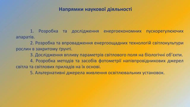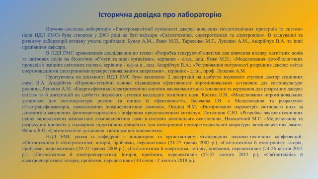 - Науково-дослідна лабораторія «Електромагнітної сумісності джерел живлення світлотехнічних пристроїв і систем»
