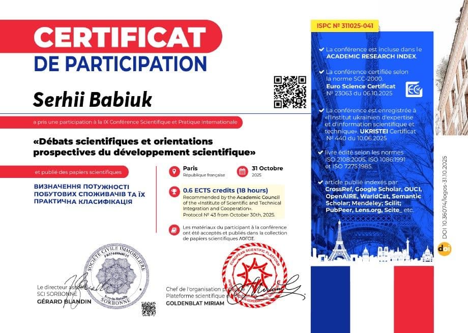 - Сертифікат про завершення тренінгу "Автоматизовані системи силової автоматики та електроніки" SEBNSKILSpace. 06.12.2023 р.