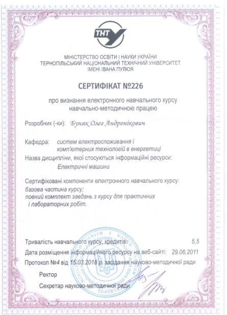 - Сертифікат про визнання електронного навчального курсу навчально-методичною працею: дисципліна «Електричні машини» (Сертифікат № 226 від 15 березня 2018 року).
