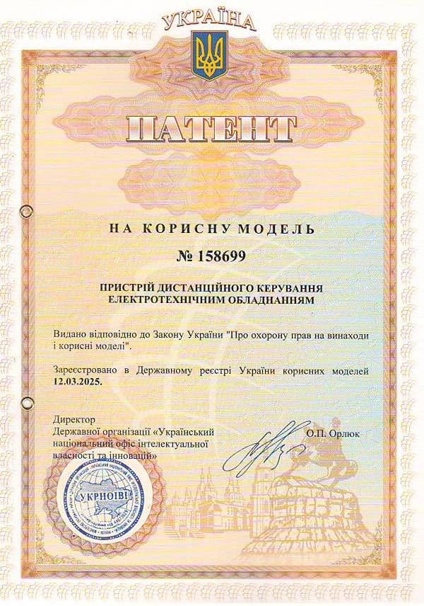 Патент на корисну модель. Пристрій дистанційного керування електротехнічним обладнанням: пат. 158699 Україна: H02J 13/00 (2025.01); G08C 17/02 (2006/01); подан. 26.07.2023 ; опубл. 12.03.2025, Бюл. № 11.