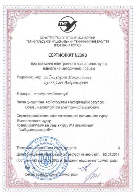 - Сертифікат про визнання електронного навчального курсу навчально-методичною працею: дисципліна «Основи метрології та електричних вимірювань» (Сертифікат № 390 від 16 лютого 2023 року).