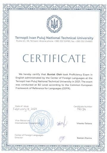 - Сертифікат володіння англійською мовою на рівень В2 у відповідності до Commom Europeen Framework of Reference for languages (CEFR) (сертифікат № 94 від 9 лютого 2021 року).