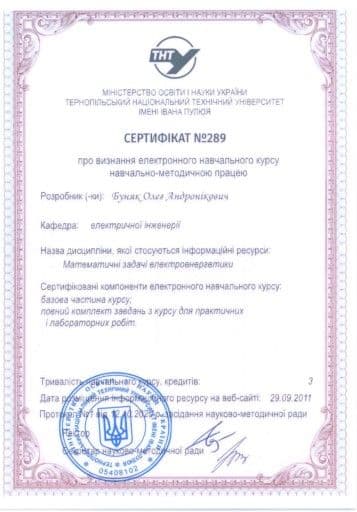 - Сертифікат про визнання електронного навчального курсу навчально-методичною працею: дисципліна «Математичні задачі електроенергетики» (Сертифікат № 289 від 12 жовтня 2020 року).