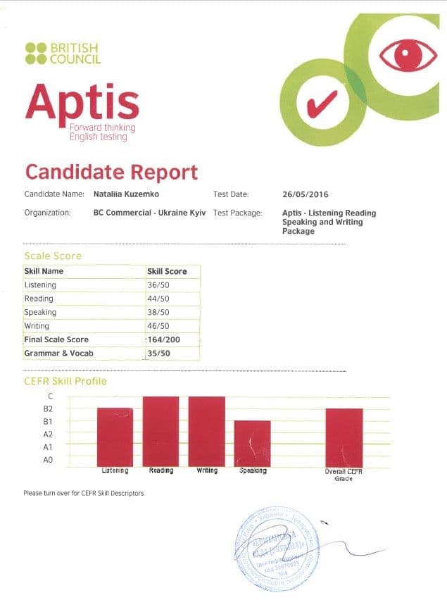 - Сертифікат рівня В2 з англійської мови за результатами здачі тестів Aptis Британської ради, 2016 р.