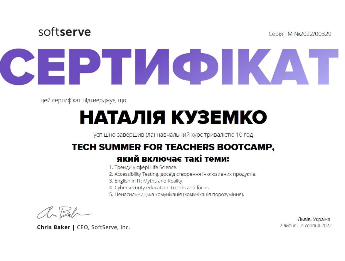 - Сертифікат Softserve Tech Summer for Teachers Bootcamp, 2022 р.
