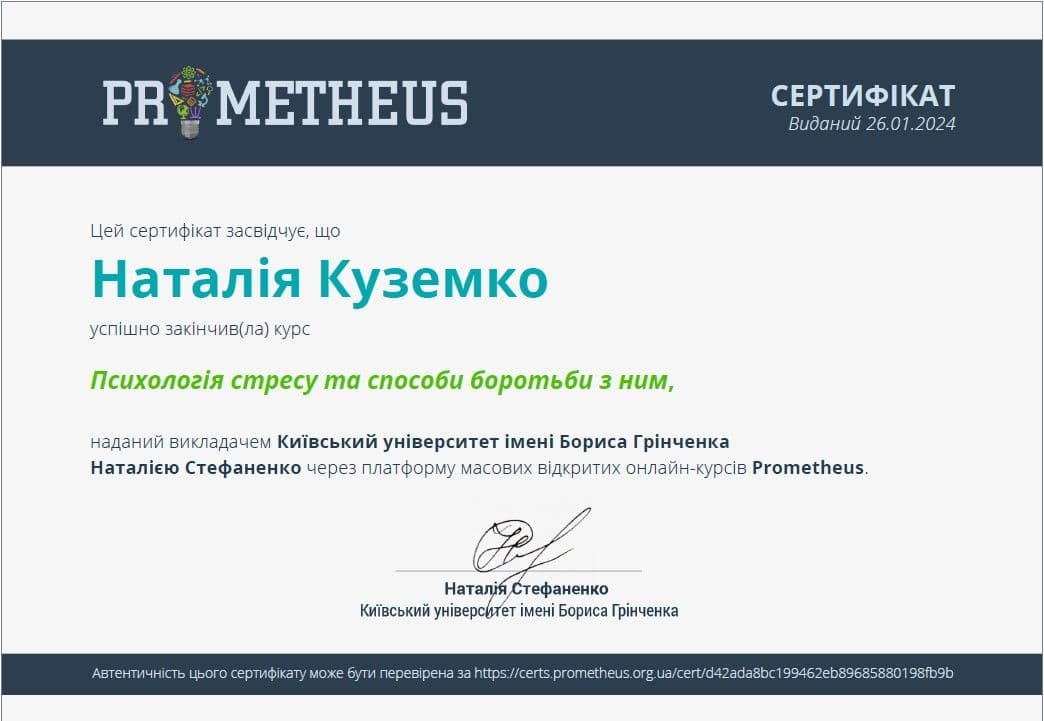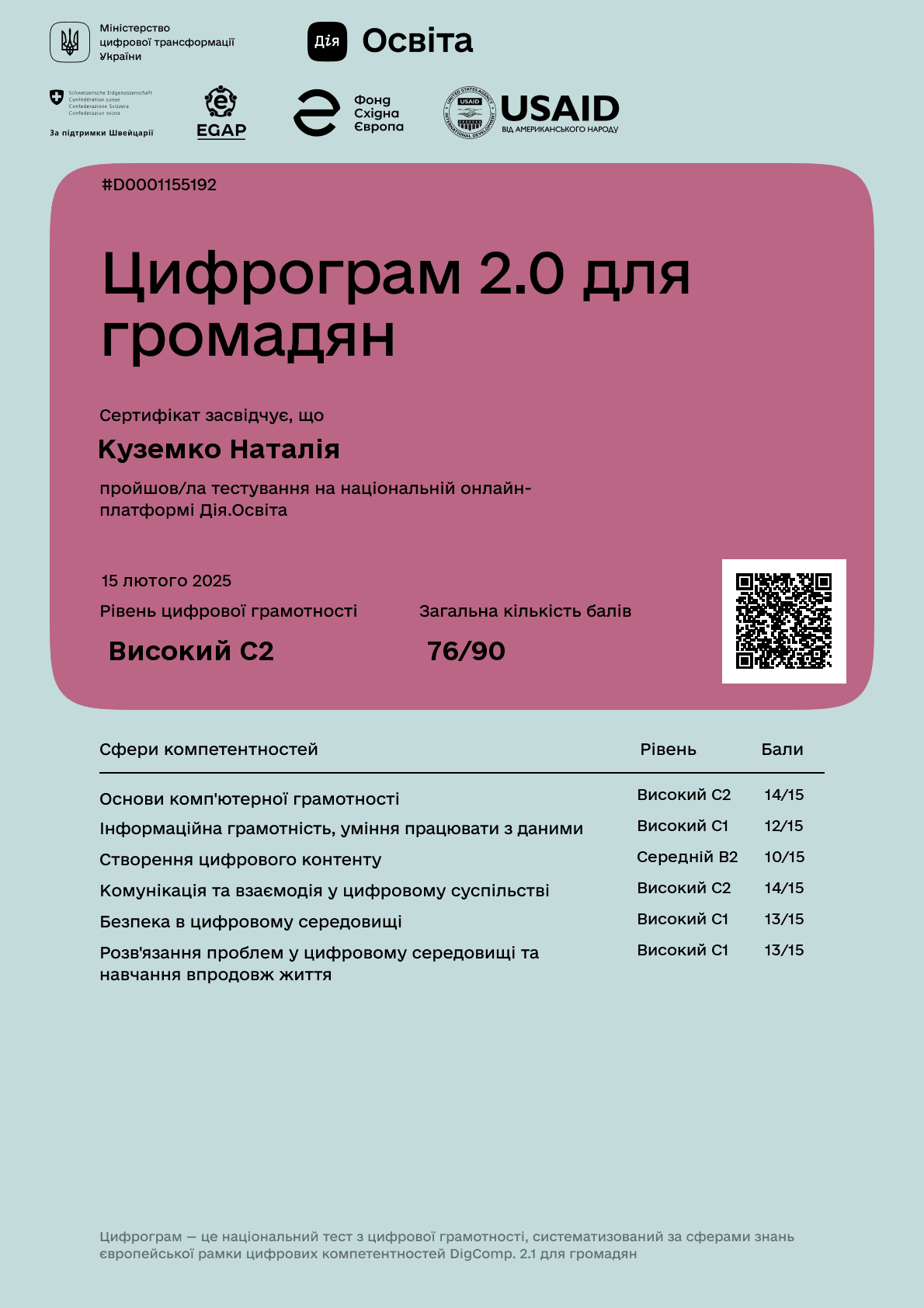 - Сертифікат проходження тестування на національній онлайн-платформі Дія. Освіта
