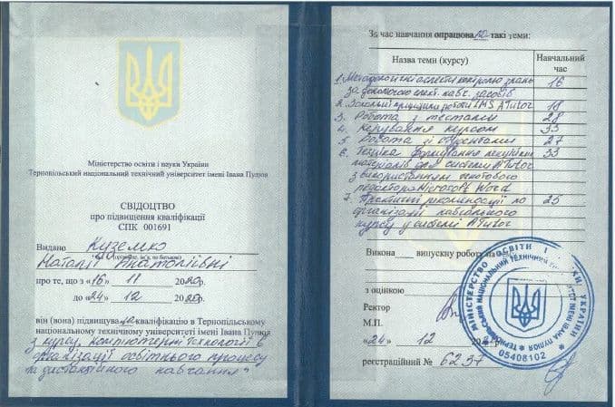 - Свідоцтво про підвищення кваліфікації СПК 001691 в Тернопільському національному технічному університеті ім. І. Пулюя, (тривалість 180 годин/6 кредитів ЄКТС) з 16.11.20 по 24.12.20.