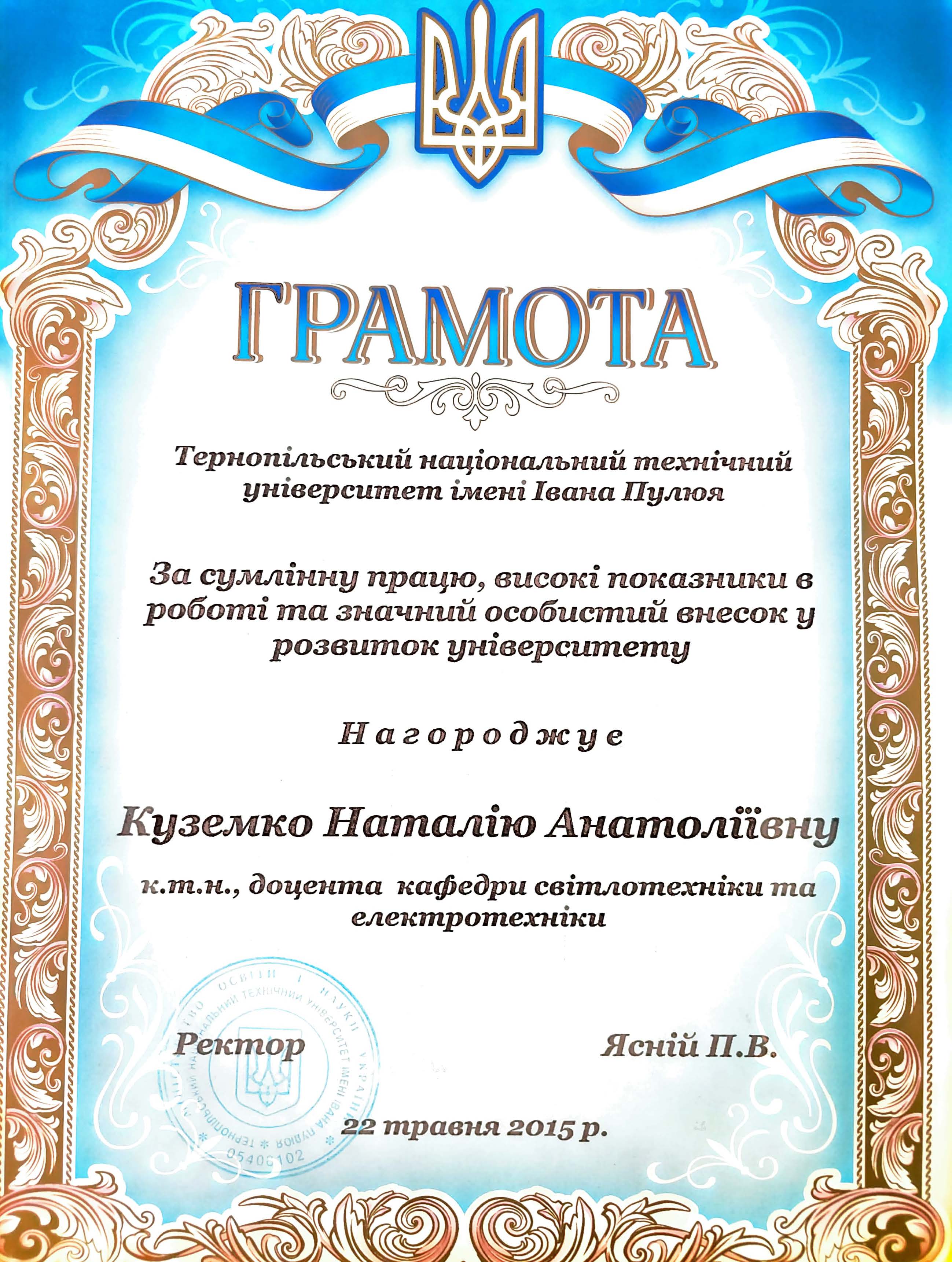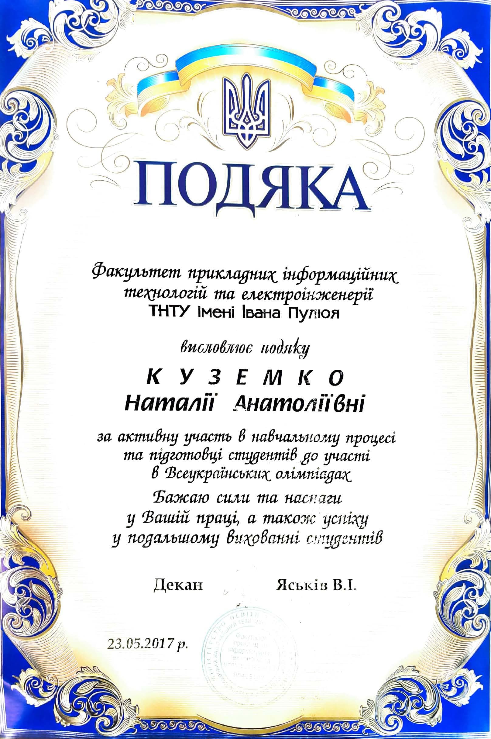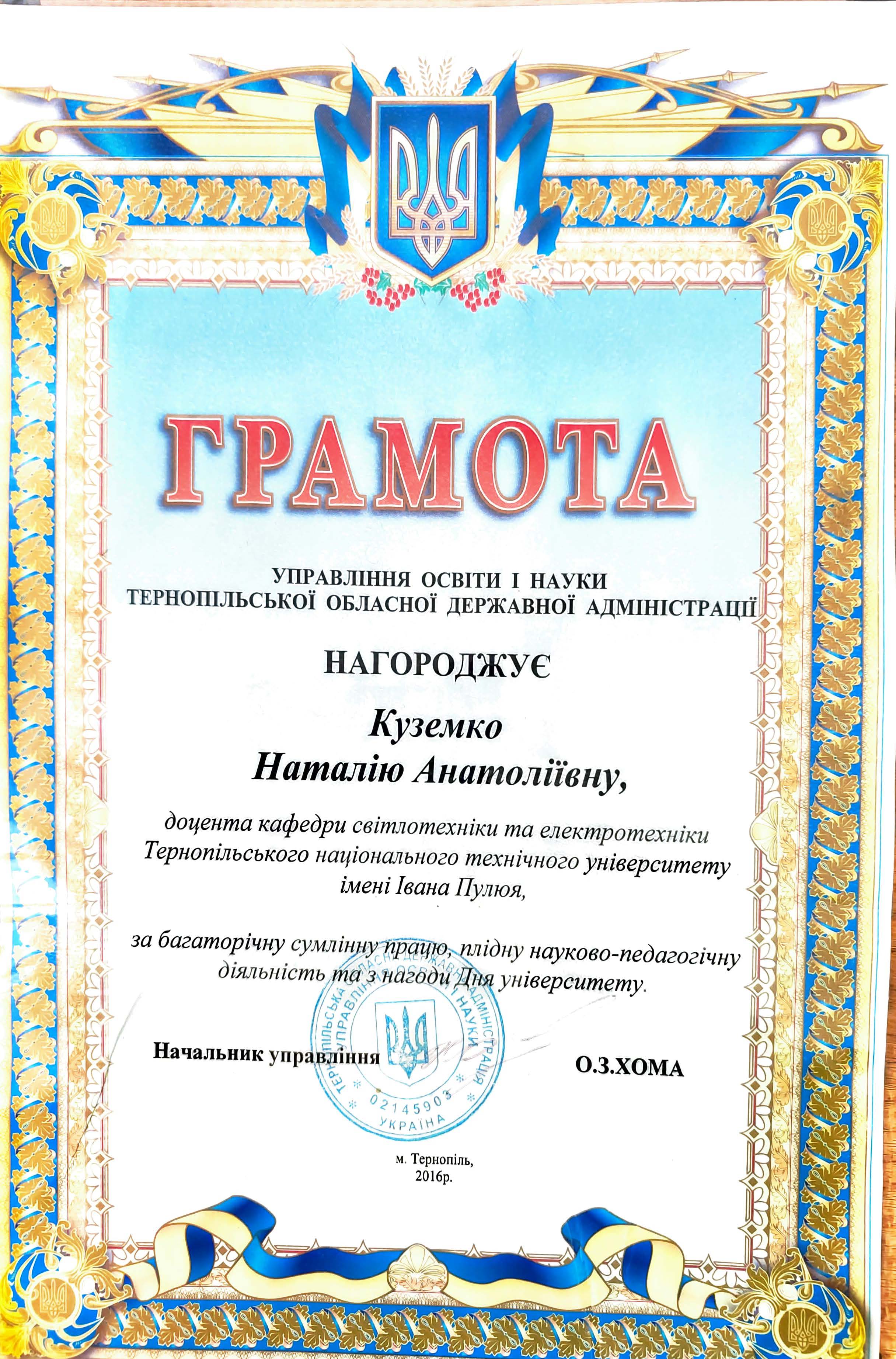 - Сертифікат учасника програми Британської ради в Україні в рамках проекту «Англійська для університетів» «Academic Teaching Excellence. English as a medium of instruction», 2016 р.