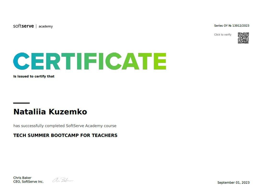 - Сертифікат участі у навчальному курсі «Tech Summer Bootcamp for Teachers», Softserve Academy (тривалість 10 годин/0.3 кредитів ЄКТС) з 26.07.23 по 1.09.23.