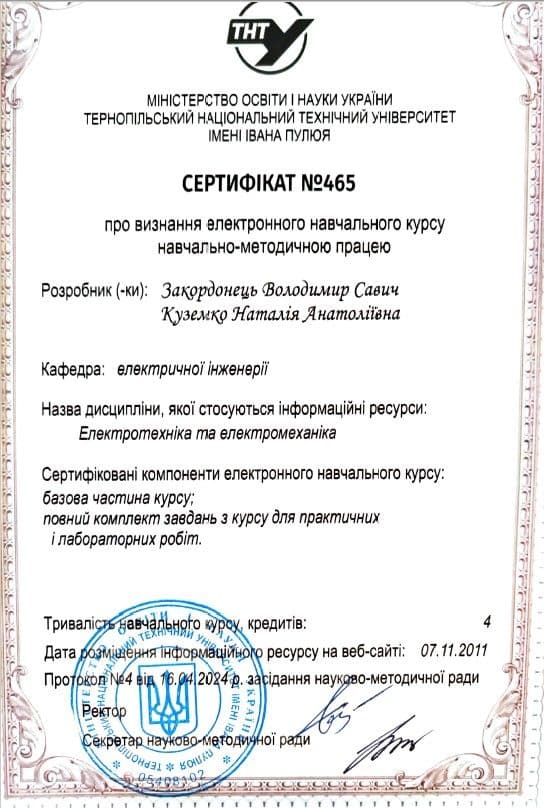 - Закордонець В.С., Куземко Н.А. Електронний навчальний курс «Електротехніка та електромеханіка». Сертифікат № 465 від 2024-16-04.