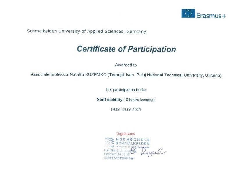 - Сертифікат участі у програмі академічної мобільності Erasmus+ в Університеті прикладних наук, м.Шмалькальден, Німеччина, з 19.06.23 по 23.06.23.