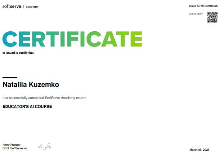 - Сертифікат про проходження навчального курсу «Educators AI Course», Softserve Academy (1 кредит ЄКТС). AS № 23249/2025 від 6.03.2025.