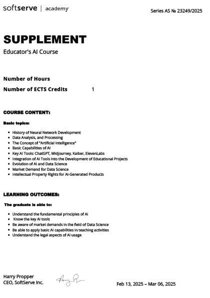 - Підвищення кваліфікації у SoftServe Academy за програмою підготовки «Educator’s AI Course» («Курс ШІ для викладача») в період з 13.02.2025 р. по 06.03.2025 р. з обсягом навчального навантаження (1 кредит ЄКТС)