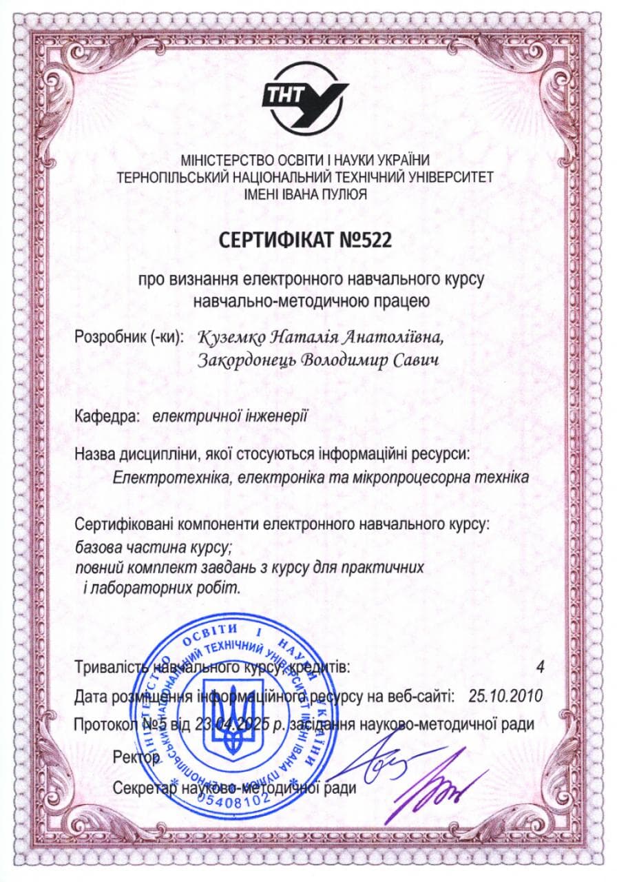 - Сертифікат № 522 від 23.04.2025 р. про визнання електронного навчального курсу «Електротехніка, електроніка та мікропроцесорна техніка» навчально-методичною працею.