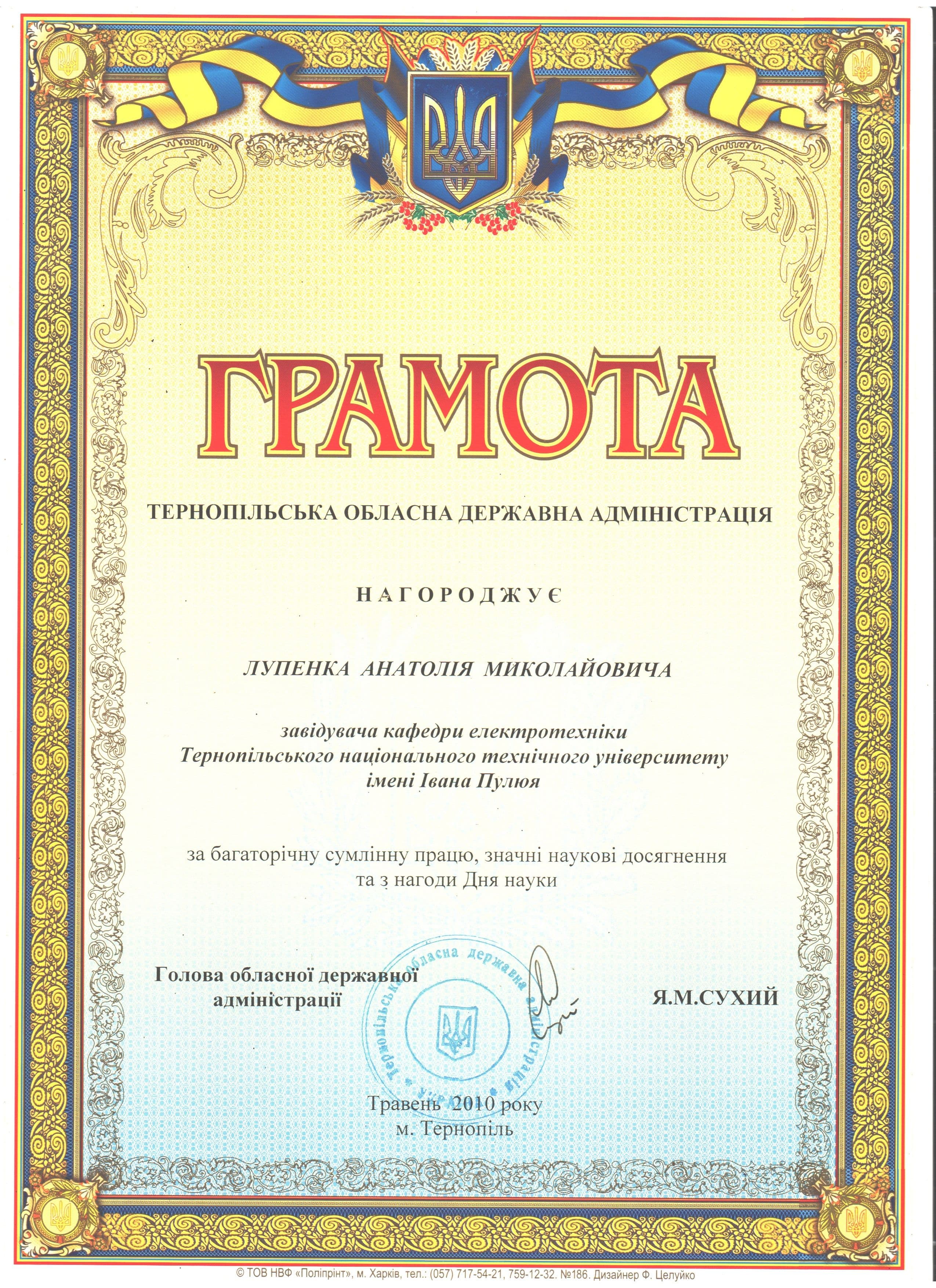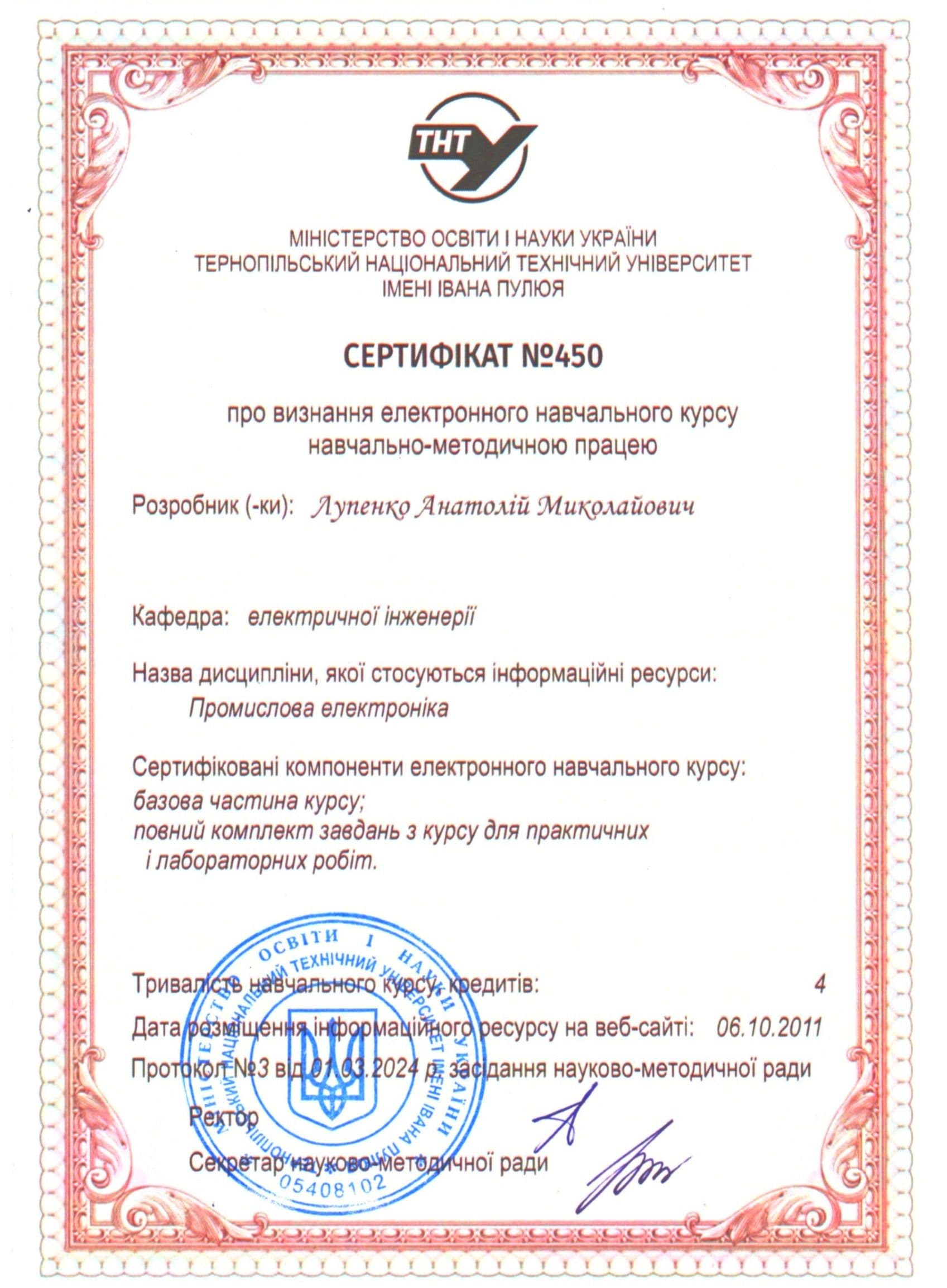 - • Сертифікат № 450 від 01.03.2024 р. про визнання навчально-методичною працею електронний навчальний курс «Промислова електроніка», виданий ТНТУ імені Івана Пулюя.