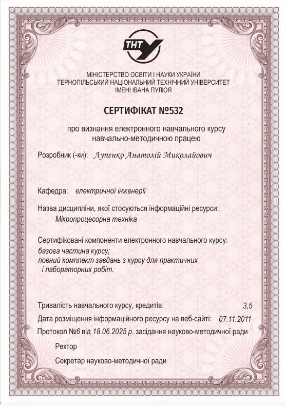 - • Сертифікат № 532 від 18.06.2025 р. про визнання навчально-методичною працею електронний навчальний курс «Мікропроцесорна техніка», виданий ТНТУ імені Івана Пулюя.