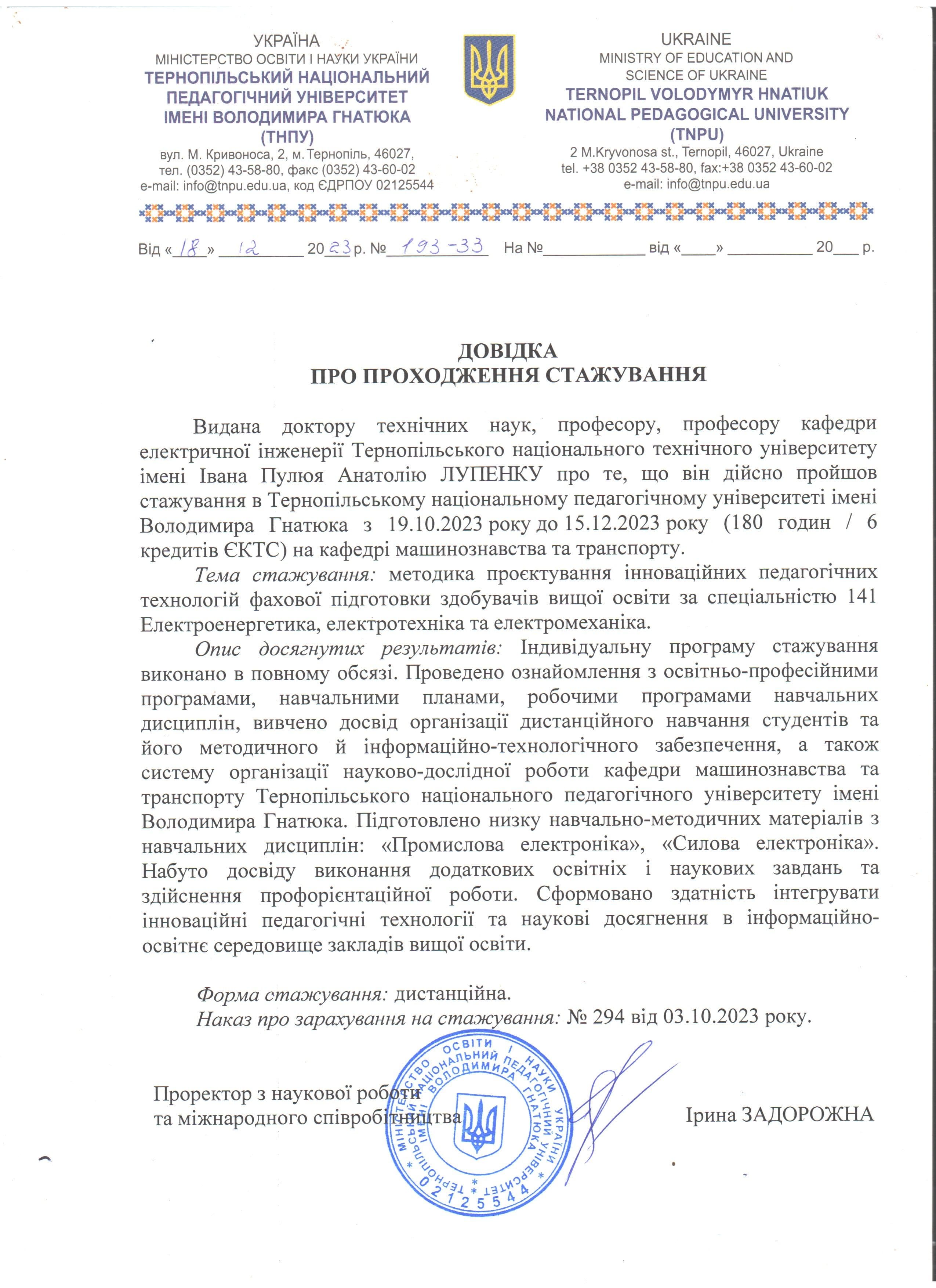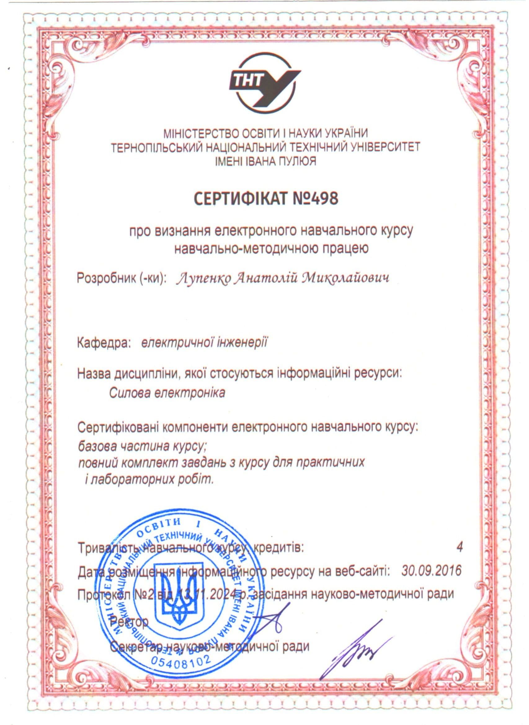 - • Сертифікат № 498 від 13.11.2024 р. про визнання навчально-методичною працею електронний навчальний курс «Силова електроніка», виданий ТНТУ імені Івана Пулюя.