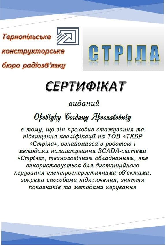 - Сертифікат про проходження навчання в Тернопільському конструкторському бюро радіозв’язку «Стріла»