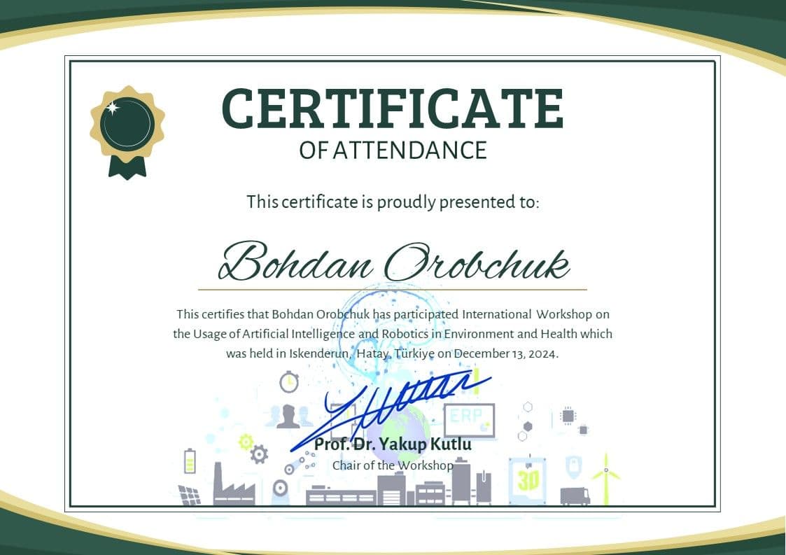 - Certificate of Attendance. International Workshop on the Usage of Artificial Intelligence and Robotics in Environment and Health (Hatay, Türkiye on December 13, 2024)