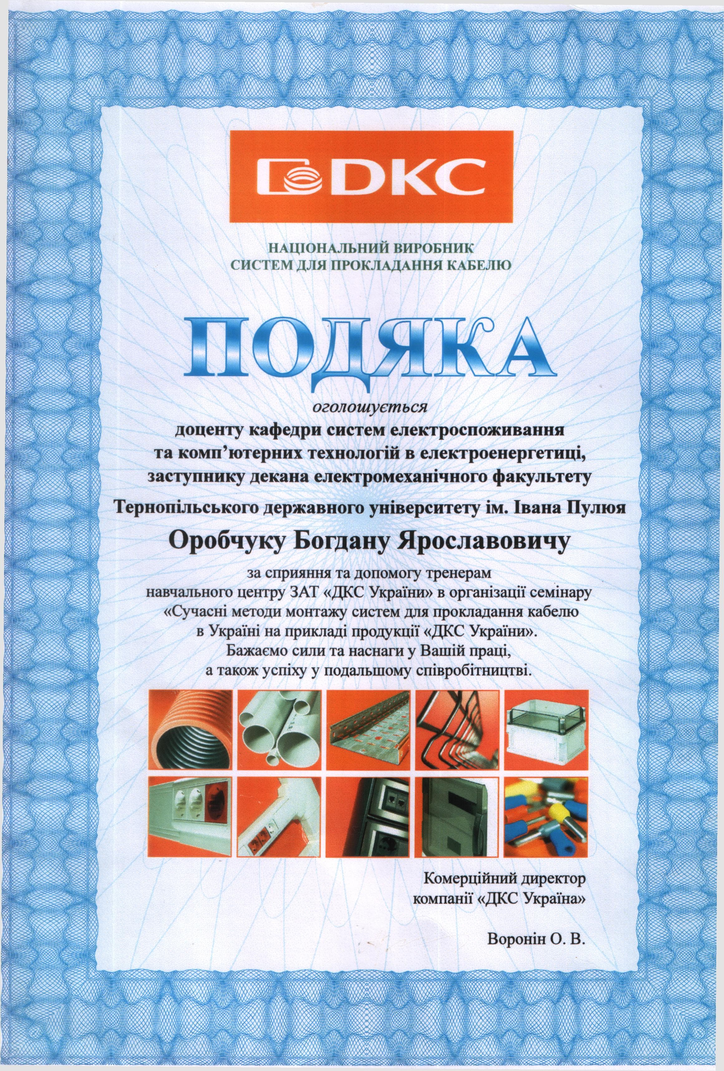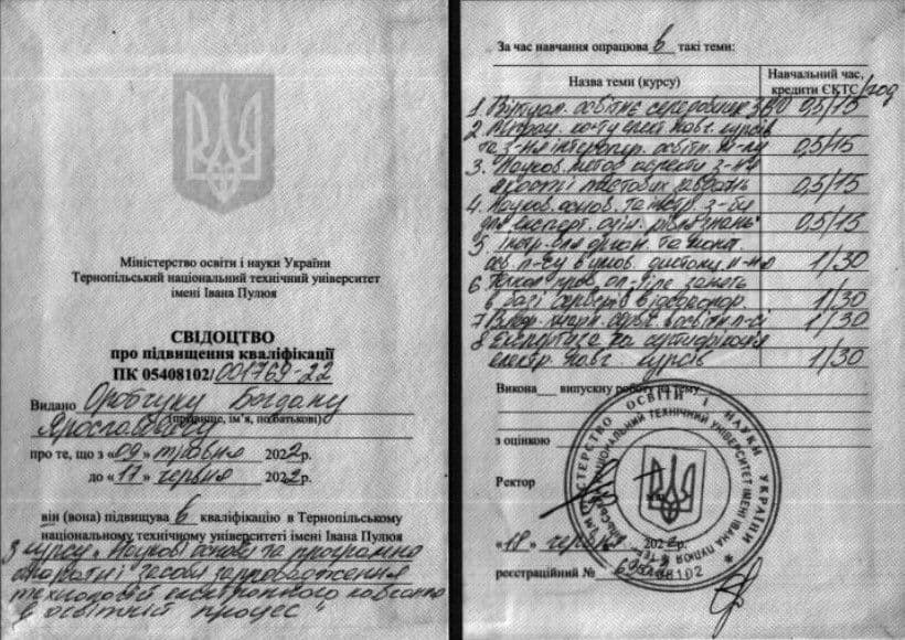 - Свідоцтво про підвищення кваліфікації на базі ТНТУ ім. І. Пулюя
