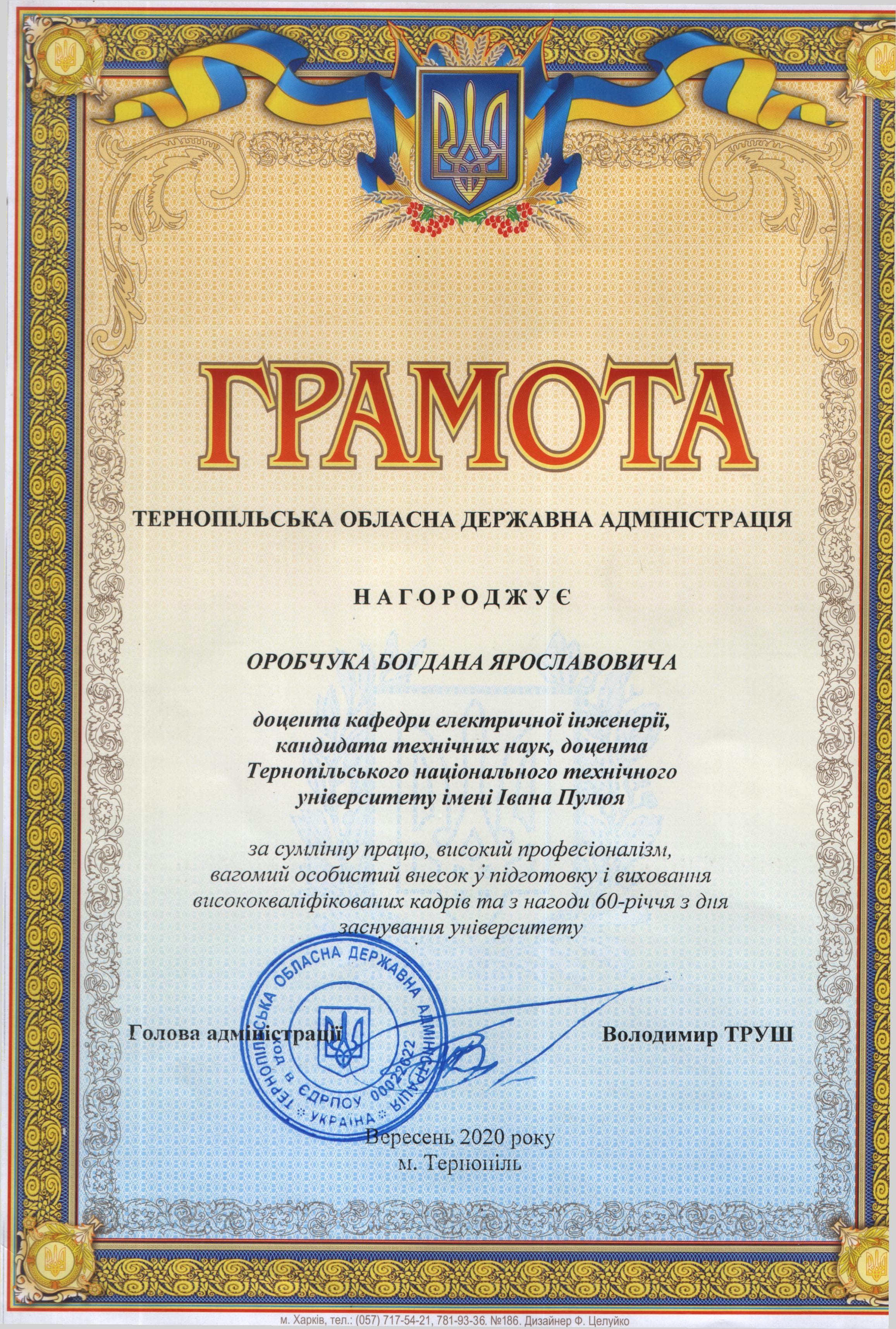 - Грамота Тернопільської обласної ради з нагоди 60-річчя з дня заснування університету, 2020 р.