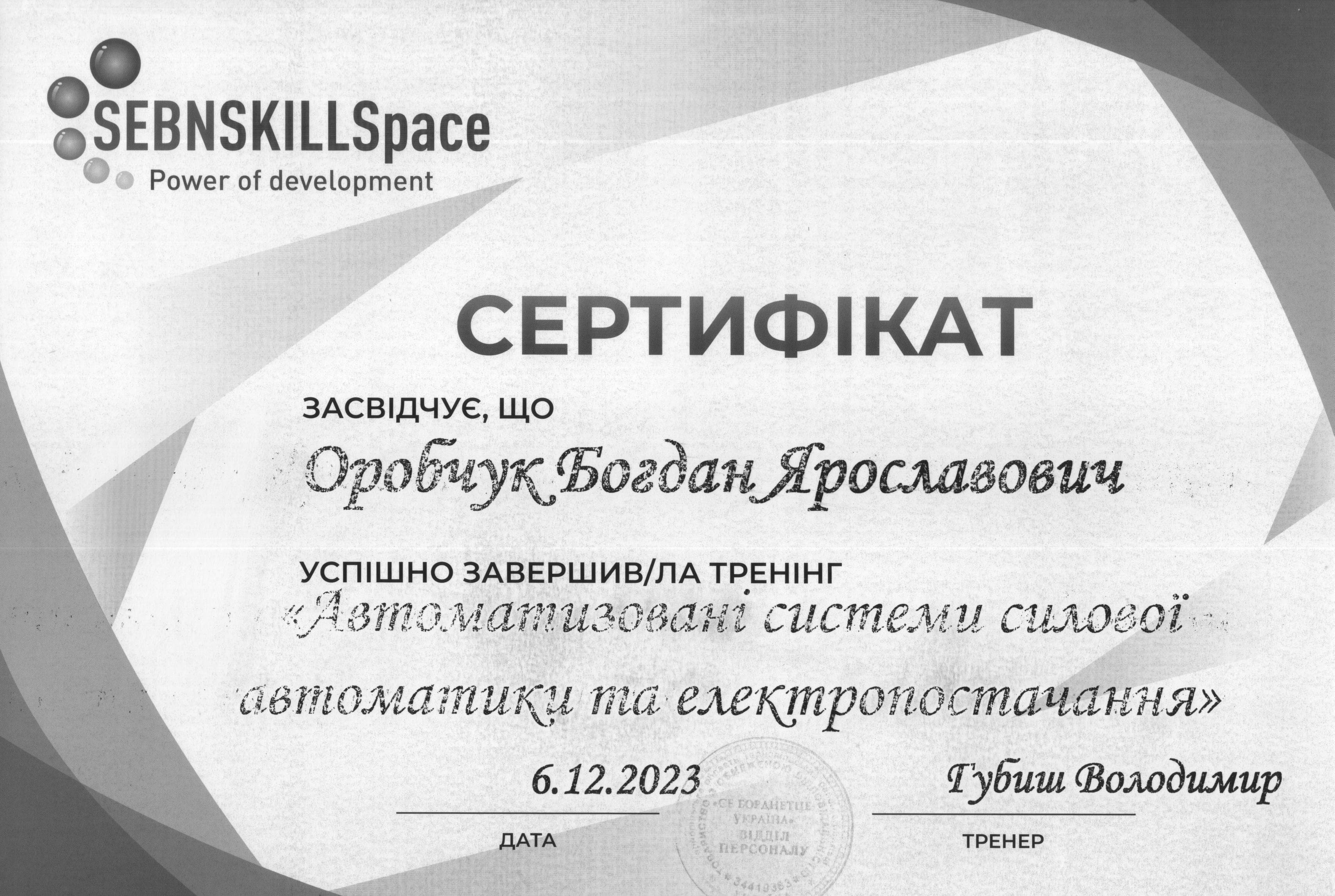 - Сертифікат про завершення тренінгу "Автоматизовані системи силової автоматики та електроніки" SEBNSKILSpace. 06.12.2023 р.