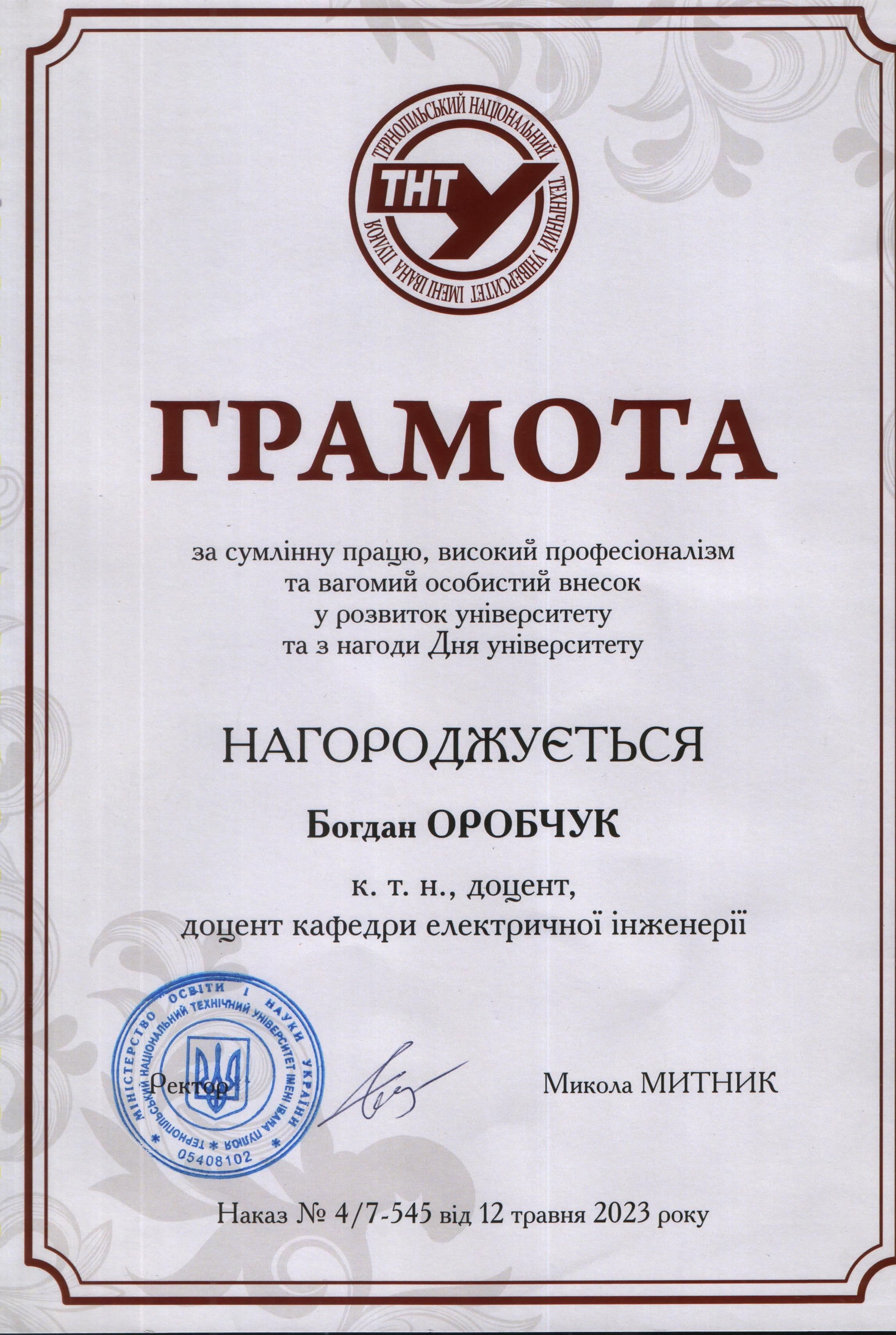 - Сертифікат № ДН 396 від 21.04.2023р. про визнання інформаційних ресурсів навчально-методичною працею електронний навчальний курс «Прикладне програмне забезпечення в електроенергетиці», виданий ТНТУ імені Івана Пулюя