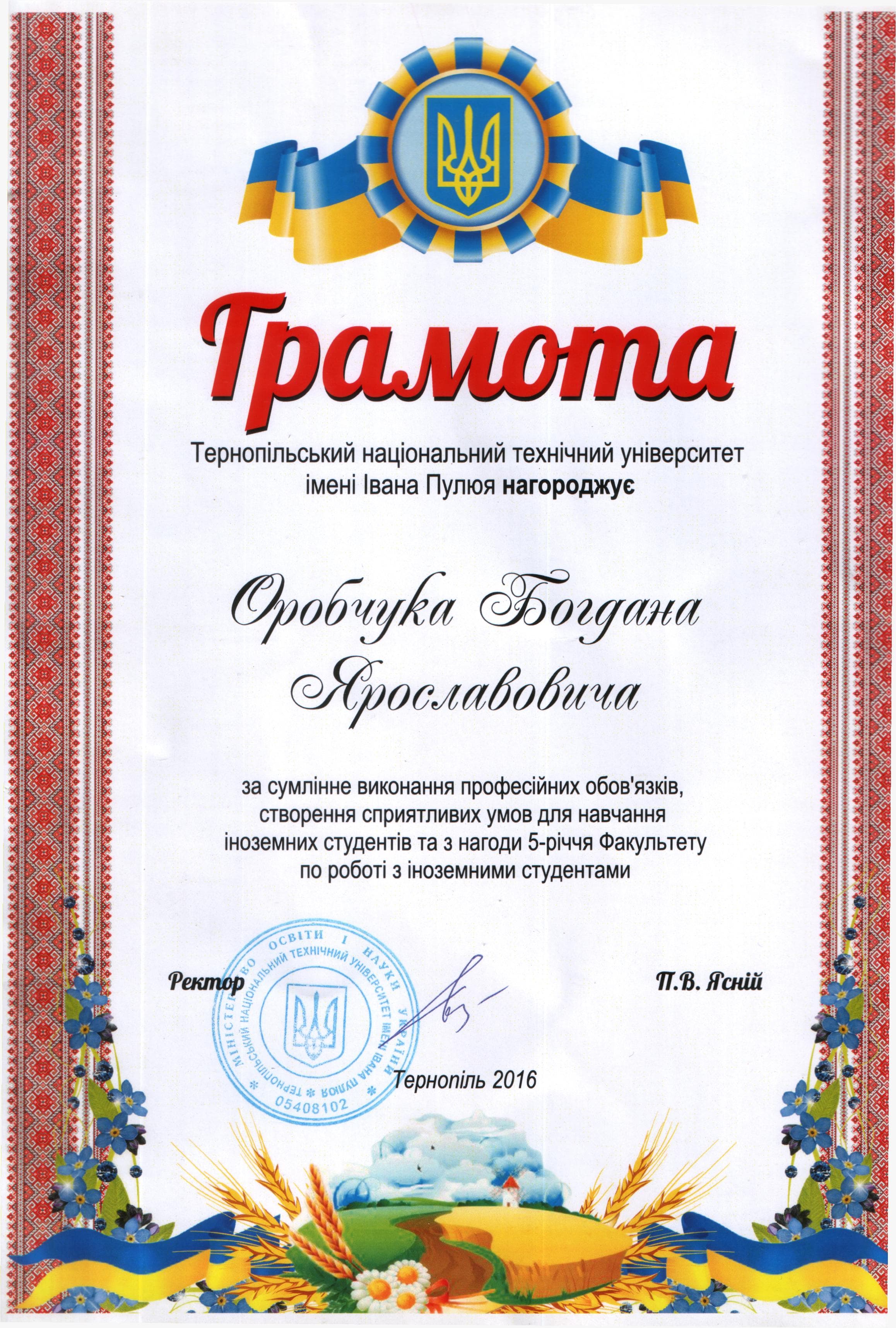 - Грамота Тернопільської обласної державної адміністрації з нагоди 50-річчя від дня утворення вищого навчального закладу, 2010 р.