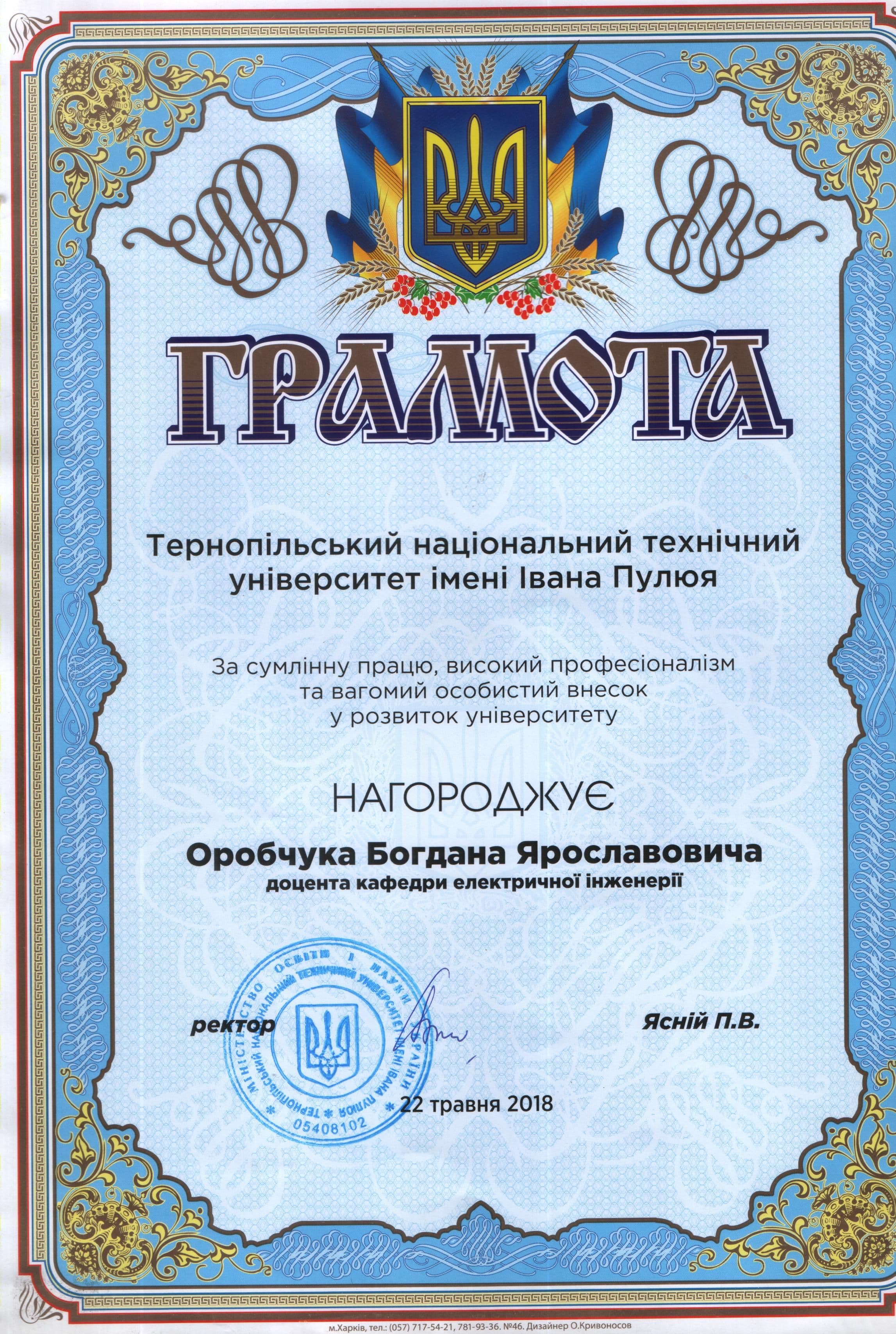- Грамоти, Подяки, Дипломи Тернопільського національного університету ім. І. Пулюя за організацію роботи зі студентами на посаді заступника декана факультету (2008 – 2018 рр.)