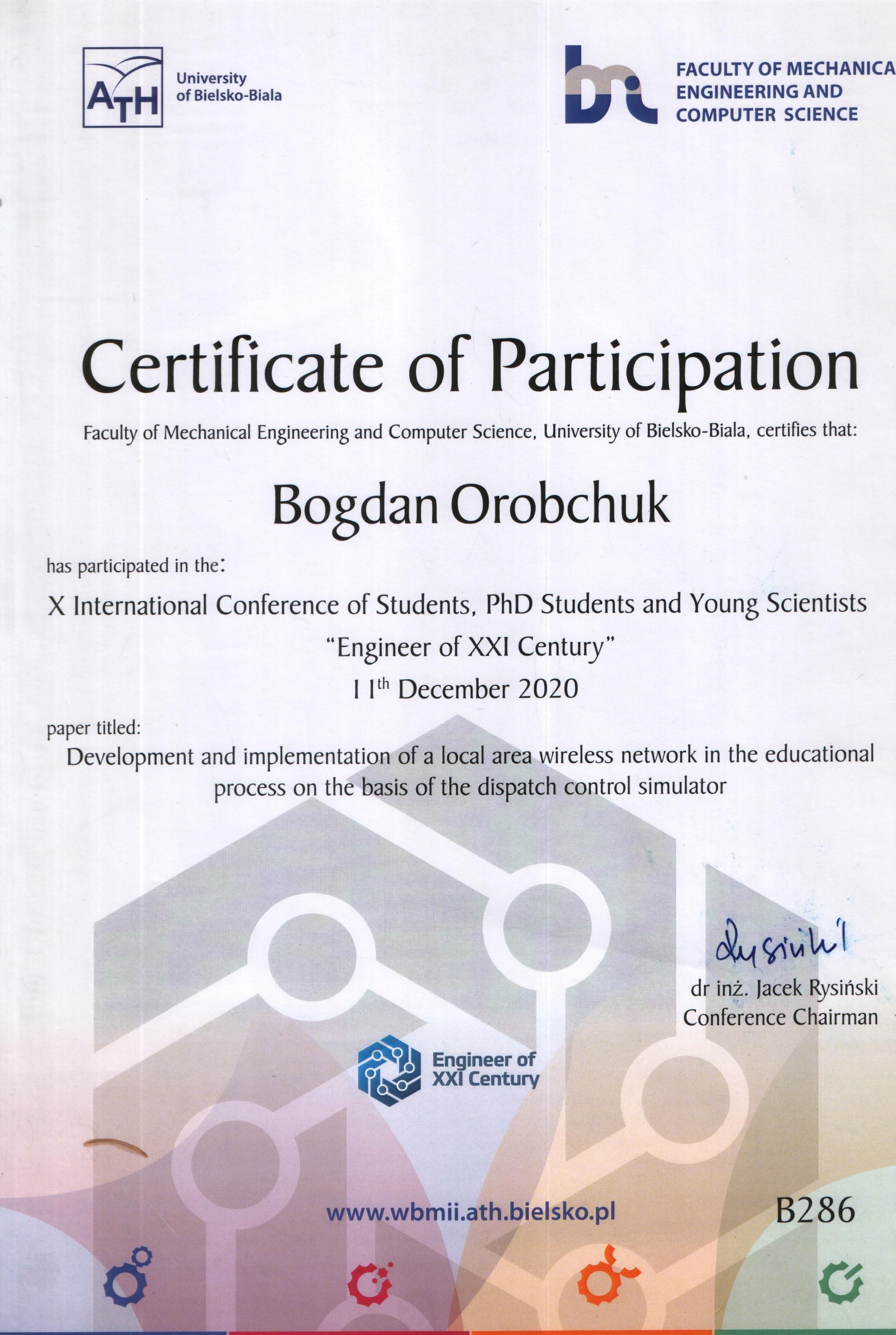 - Certificate of Participation X Internacional Conference of Students, PhD and Young Scientists. University of Bielsko-Biala? Polland (11.12.2020)