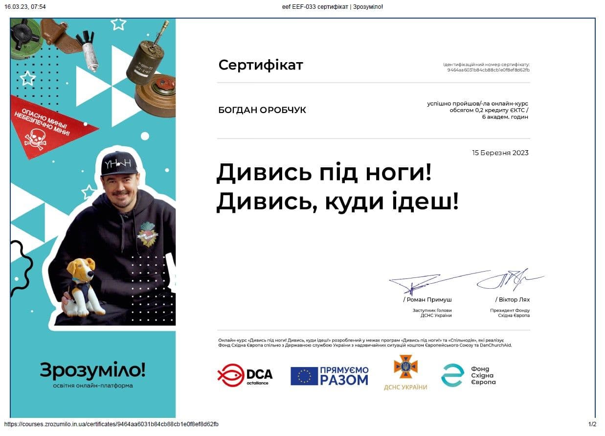 - Сертифікат освітньої онлайн платформи Зрозуміло! «Дивись під ноги! Дивись, куди ідеш!». Від 15.03.2023 р. обсягом 6 годин (0,2 кредити ЄКТС).