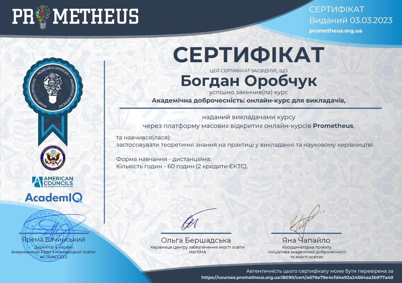 - Сертифікат онлайн курсів PROMETHEUS для викладачів «Академічна доброчесність» від 03.03.2023 р. обсягом 60 годин (2 кредити ЄКТС).