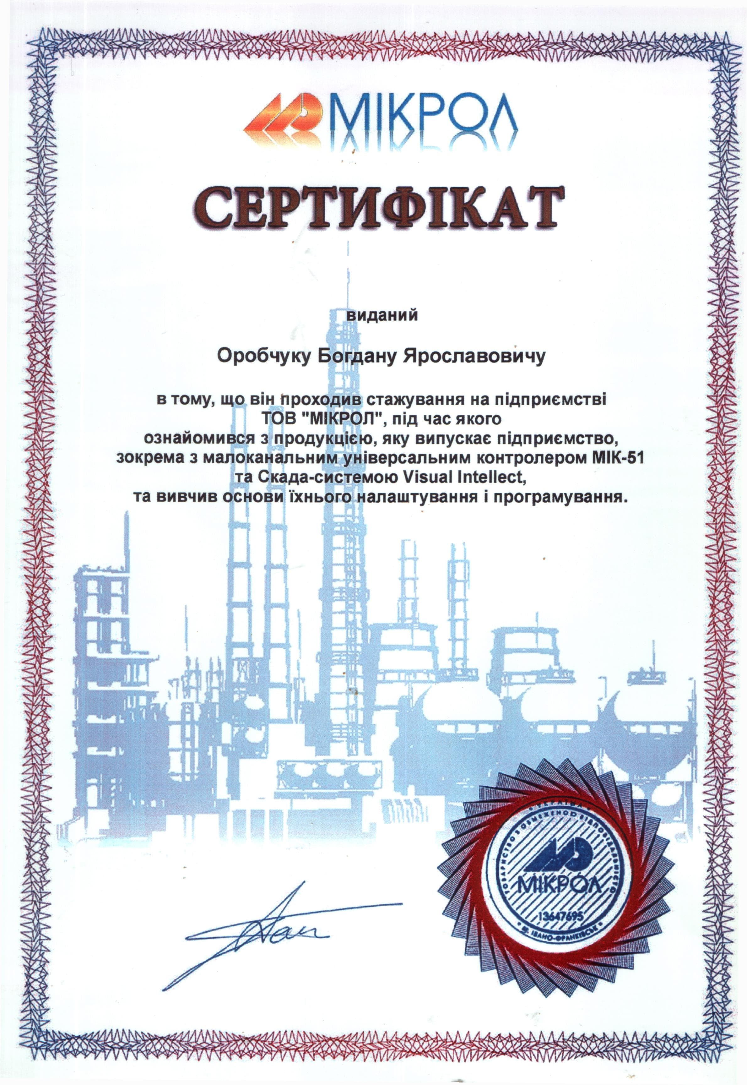 - Сертифікат про проходження навчання на підприємстві ТОВ «МІКРОЛ»