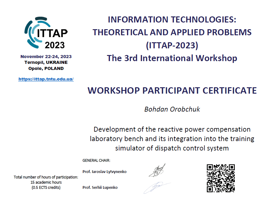 - Workshop Participant Certificate. Information Technologies: Theoretical And Applied Problems (ITTAP-2023). The 3rd International Workshop (22-24.12.2023)