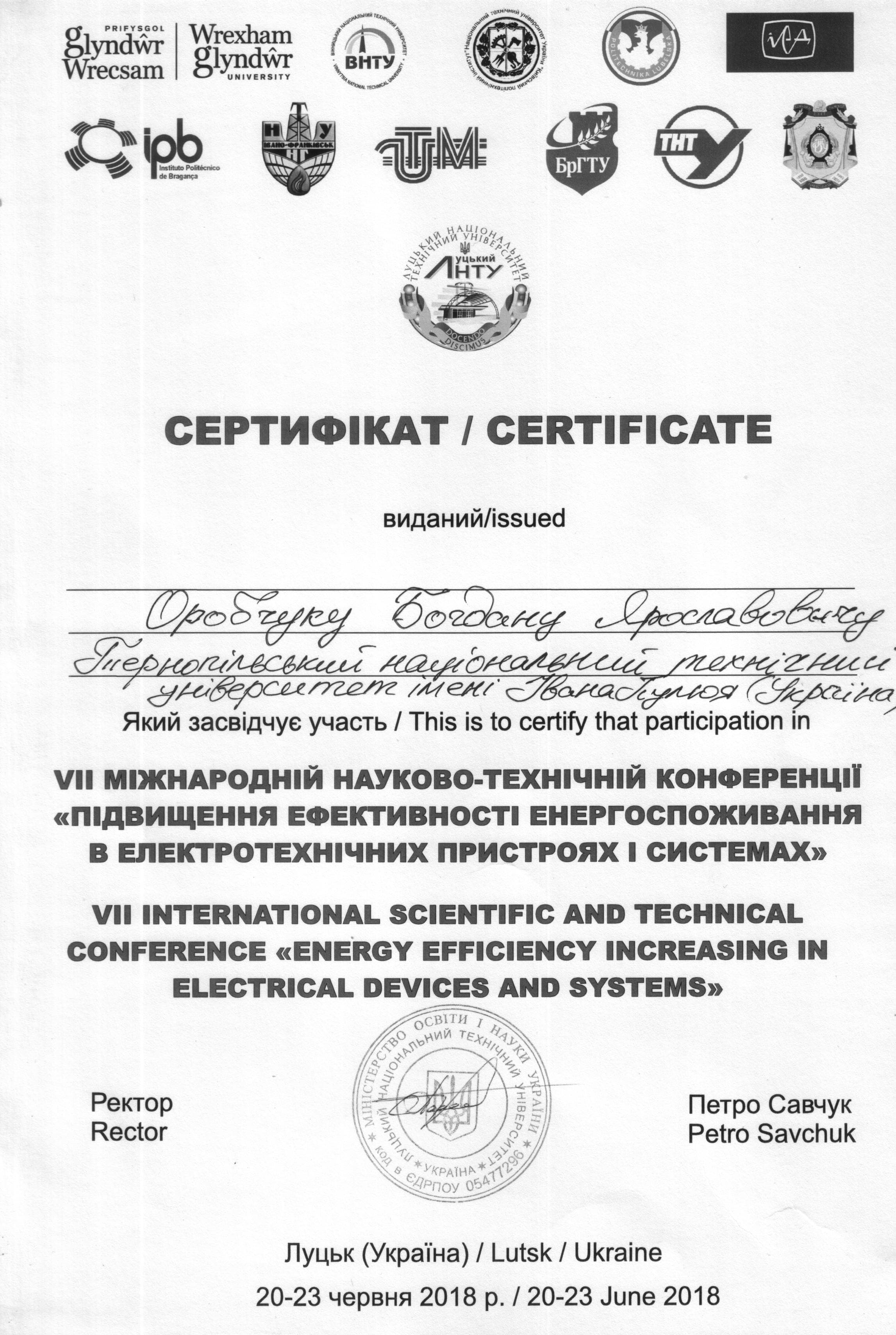 - Сертифікат, який засвідчує участь в VII Міжнародній науково-технічній конференції «Підвищення ефективності енергоспоживання в електротехнічних пристроях і системах» (Луцьк, 22-23 червня 2018 р.)