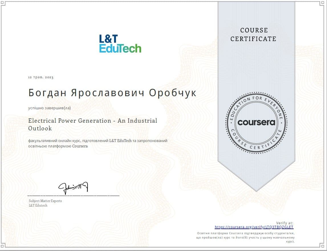 - Corrse Certificate COURSERA «Electrical Power Generation – An Industrial Outlook». Факультативний онлайн курс, підготовлений L@T EduTech та запропонований освітньою платформою Coursera (12.05.2023)
