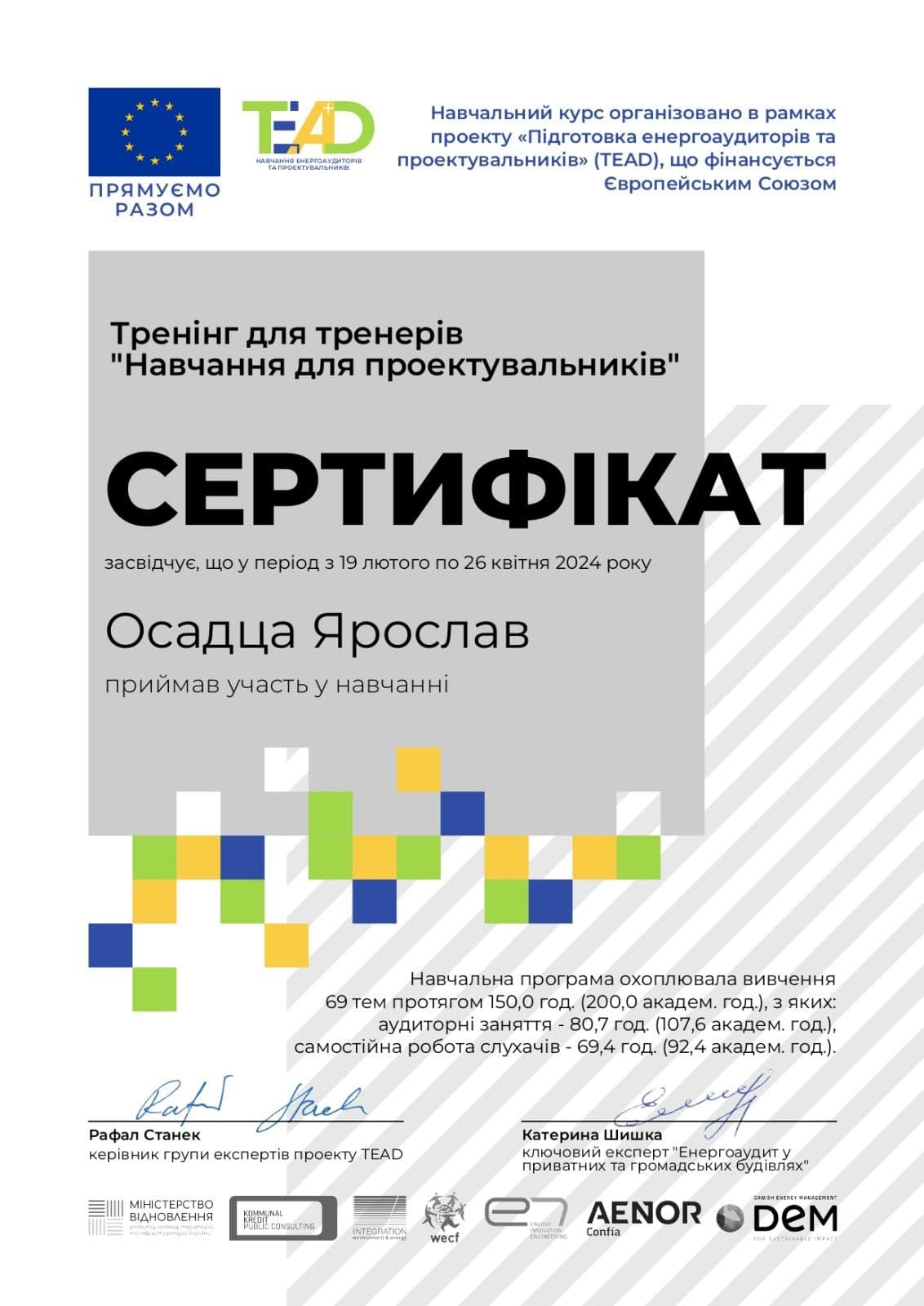 - Сертифікат про участь з 19 лютого по 26 квітня 2024 р. у тренінгу для тренерів «Навчання для проектувальників» в рамках проекту «Підготовка енергоаудиторів та проектувальників» (TEAD), що фінансується Європейським Союзом