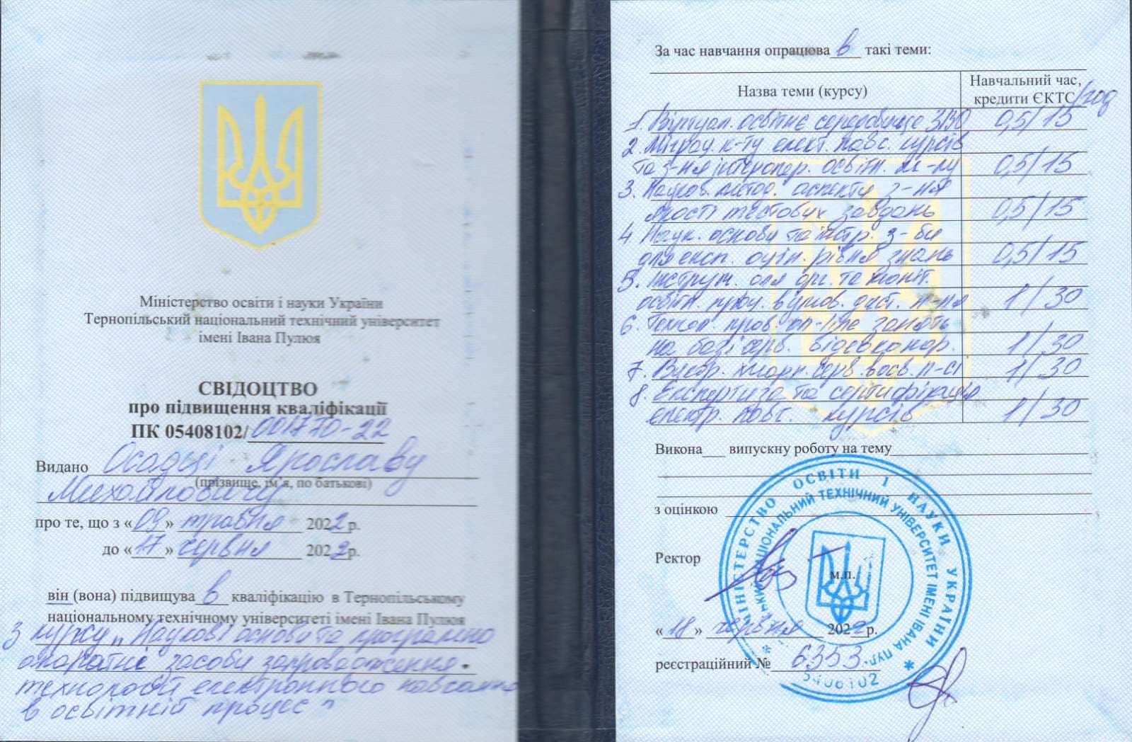 - Свідоцтво про підвищення кваліфікації ПК 408102/001770-22 з курсу «Наукові основи та програмно-апаратні засоби» видане 18.06.2022 р. Тернопільським національним технічним університетом імені Івана Пулюя