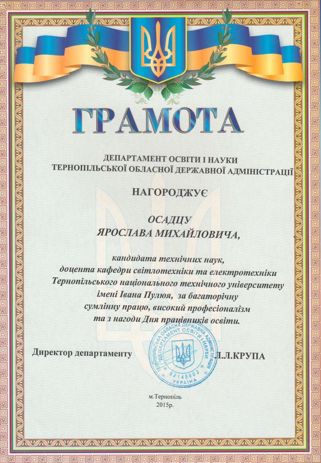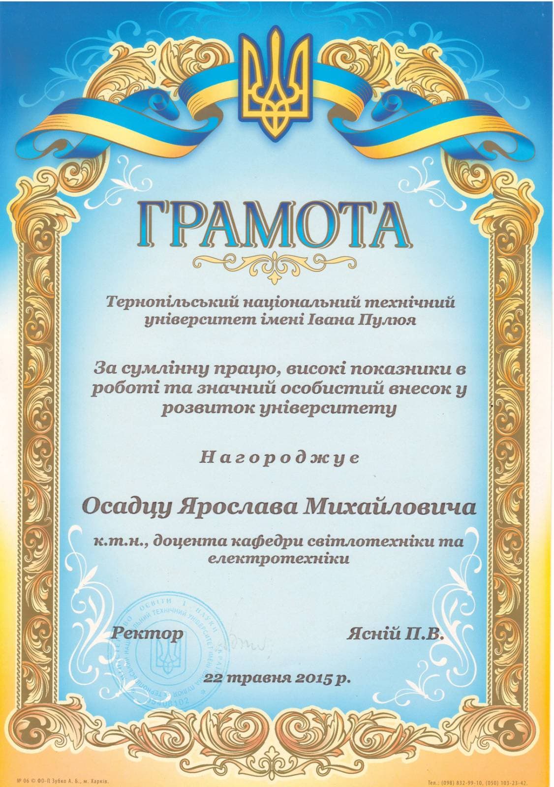 - Грамота від ректора Тернопільського національного технічного університету імені Івана Пулюя за сумлінну працю, високий професіоналізм та вагомий особистий внесок у розвиток університету, 22.05.2015