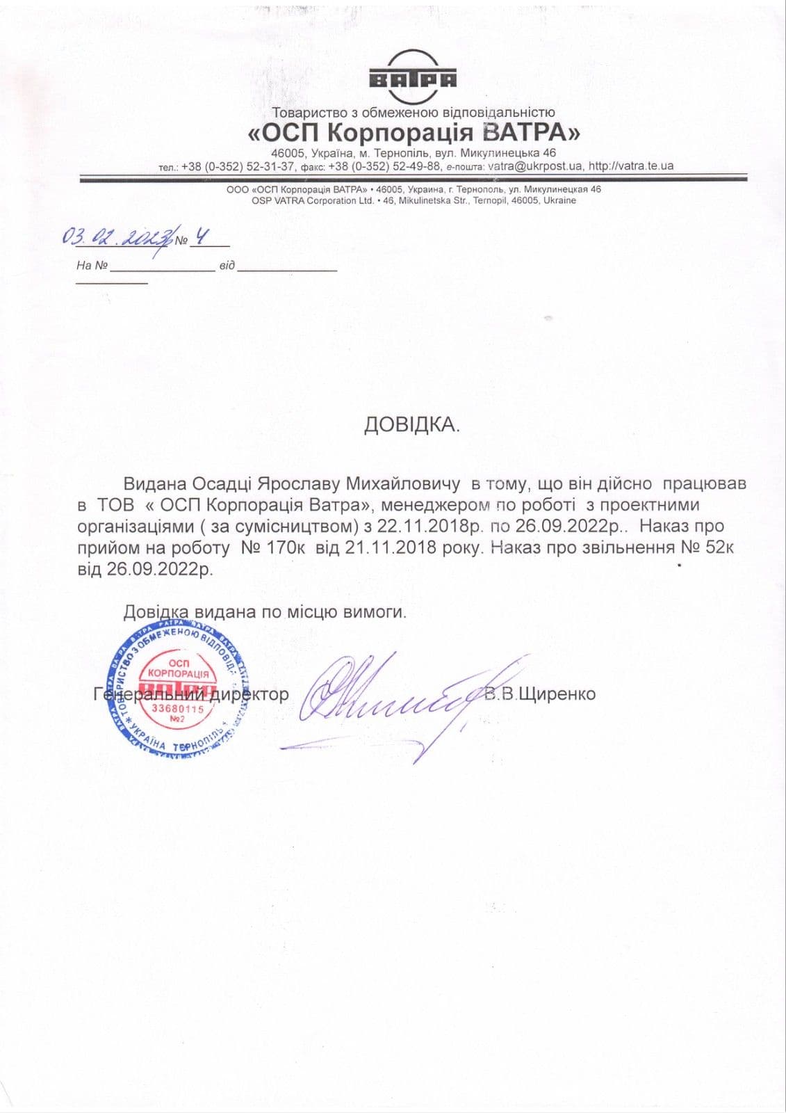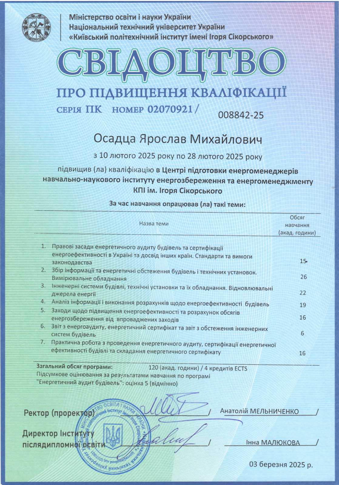 - Свідоцтво про підвищення кваліфікації ПК 02070921/008842-25 по програмі «Енергетичний аудит будівель» видане 03.03.2025 р. Центром підготовки енергоменеджерів навчально-наукового інституту енергозбереження та енергетичного менеджменту КПІ ім. Ігоря Сікорського.