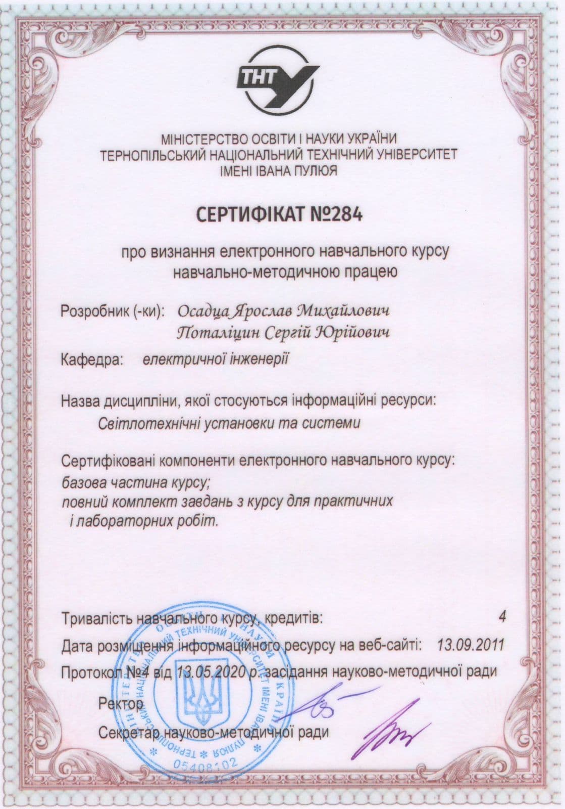 - Сертифікат № 284 від 13.05.2020 р. про визнання електронного навчального курсу «Світлотехнічні установки та системи» навчально-методичною працею.