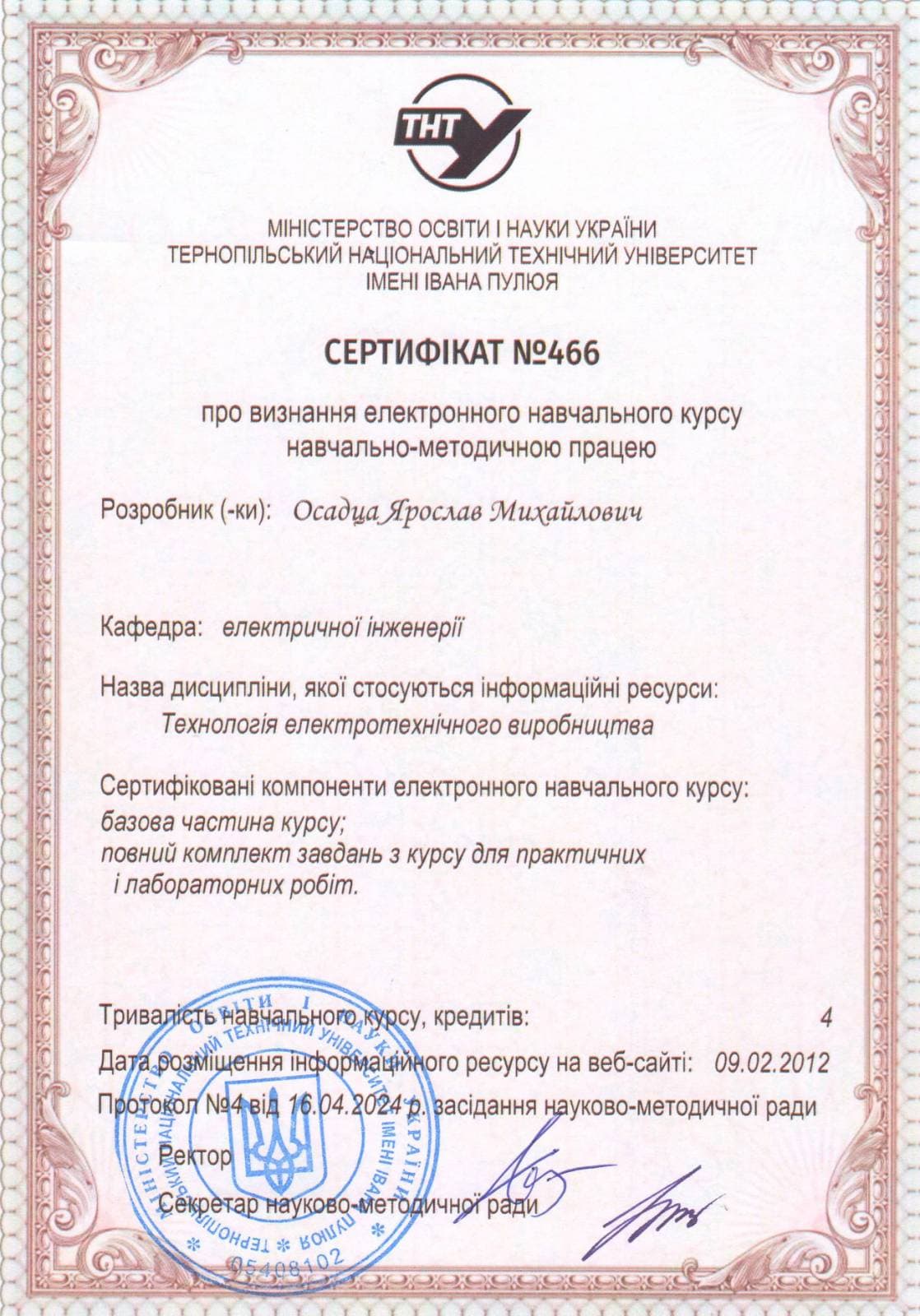 - Сертифікат № 466 від 16.04.2024 р. про визнання електронного навчального курсу «Технологія електротехнічного виробництва» навчально-методичною працею.