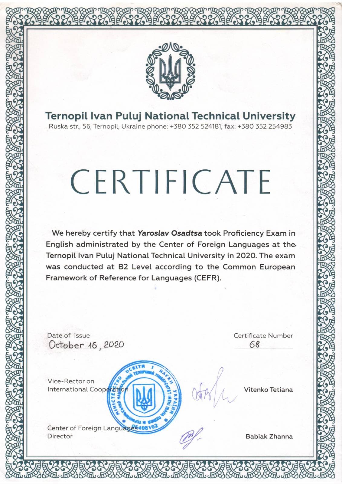 - Сертифікат № 68 про рівень володіння іноземною мовою, B2 – Common European Framework of Reference for Languages (CEFR). Виданий 16.10.2020 р. Цетром іноземних мов Тернопільського національного технічного університету імені Івана Пулюя.