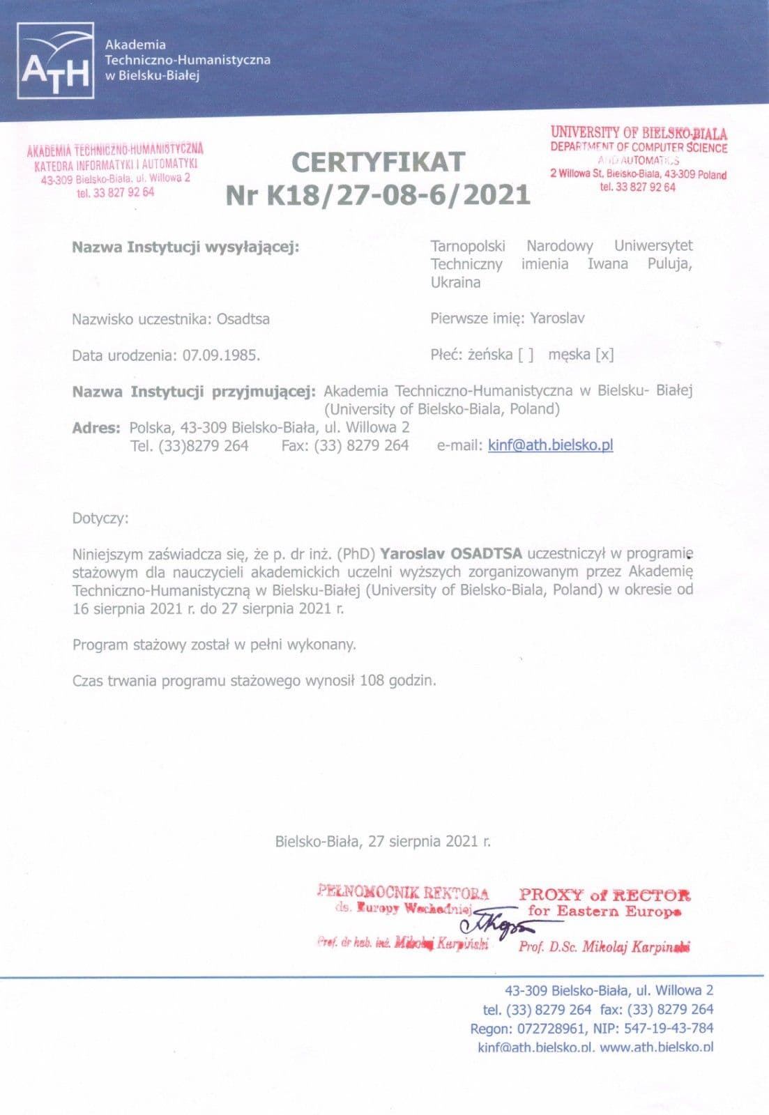- Сертифікат №К18/27-08-6/2021 про участь у міжнародному стажуванні в університеті Бельско-Бяла, Польща (тривалість 108 годин/3,6 кредити ЄКТС) з 16 по 27 серпня 2021 року.