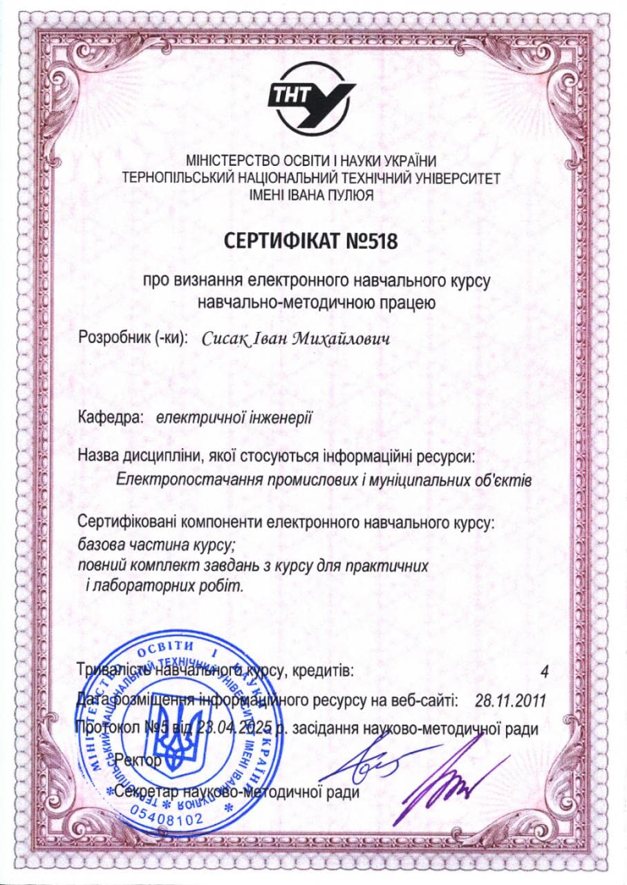 - Сертифікат № 518 від 23.04.2025 р. про визнання електронного навчального курсу «Електропостачання промислових та муніципальних об’єктів» навчально-методичною працею.