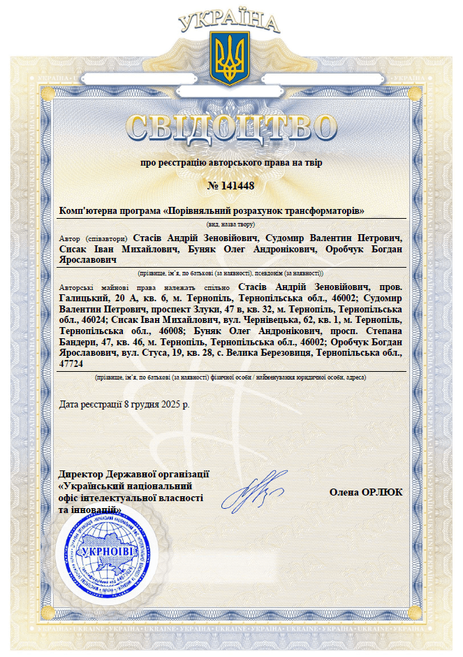 - Свідоцтво про реєстрацію авторського права на твір № 141448 Комп'ютерна програма «Порівняльний розрахунок трансформаторів». Дата реєстрації 8 грудня 2025 р.