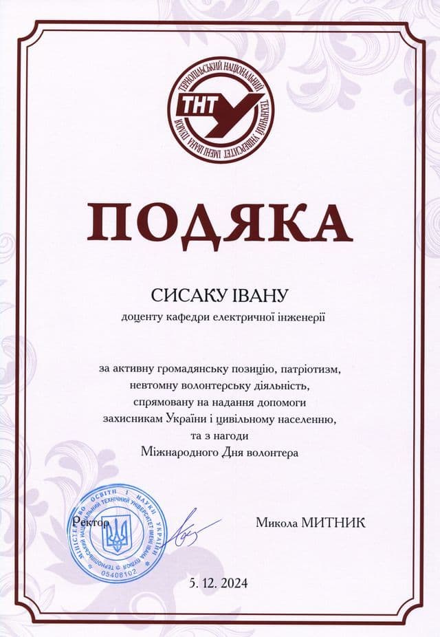 - Подяка від ректора за активну громадянську позицію, патріотизм, невтомну волонтерську діяльність, спрямовану на надання допомоги захисникам України і цивільному населенню, та з нагоди Міжнародного Дня волонтера, 05.12.2024 р.