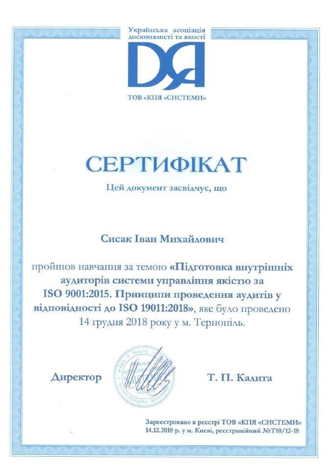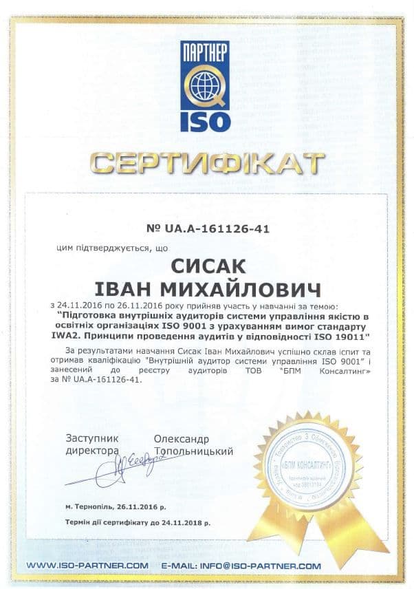 - “Внутрішній аудитор системи управління ISO 9001”, 2016 рік.