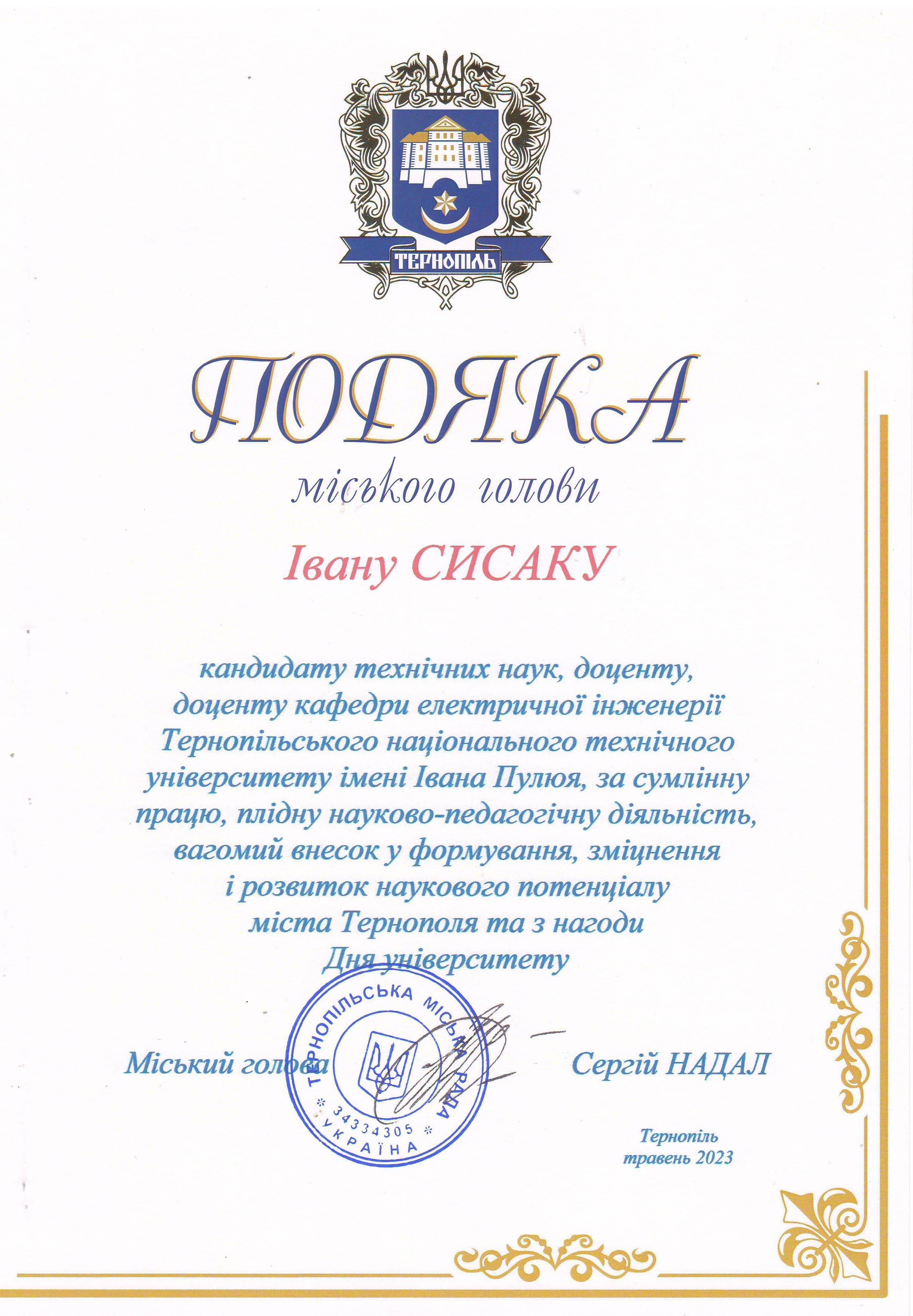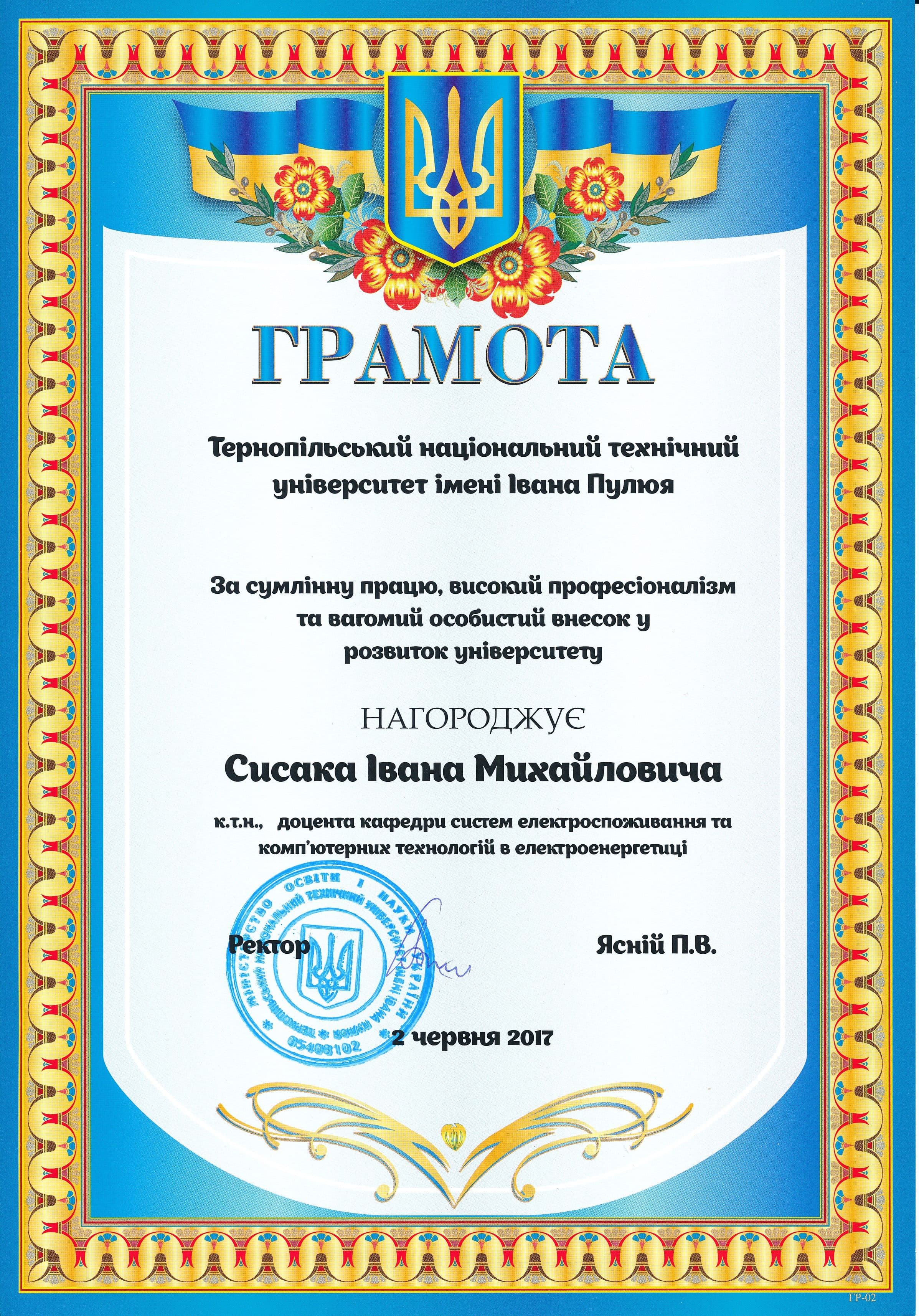 - Грамота від ректора ТНТУ за сумлінну працю, високий професіоналізм та вагомий особистий внесок у розвиток університету, 02.06.2017.