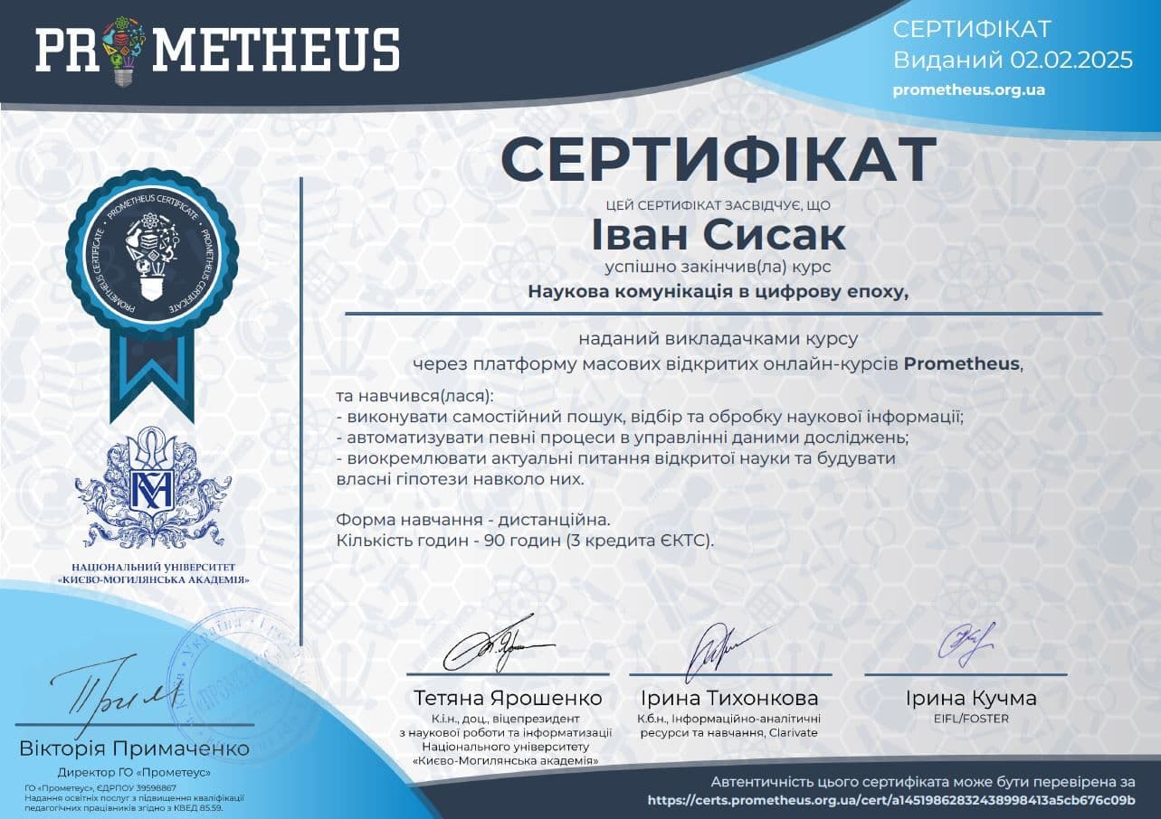 - "Сертифікат онлайн курсів PROMETHEUS "Наукова комунікація в цифрову епоху" від 02.02.2025 р. обсягом 90 годин (3 кредита ЄКТС).